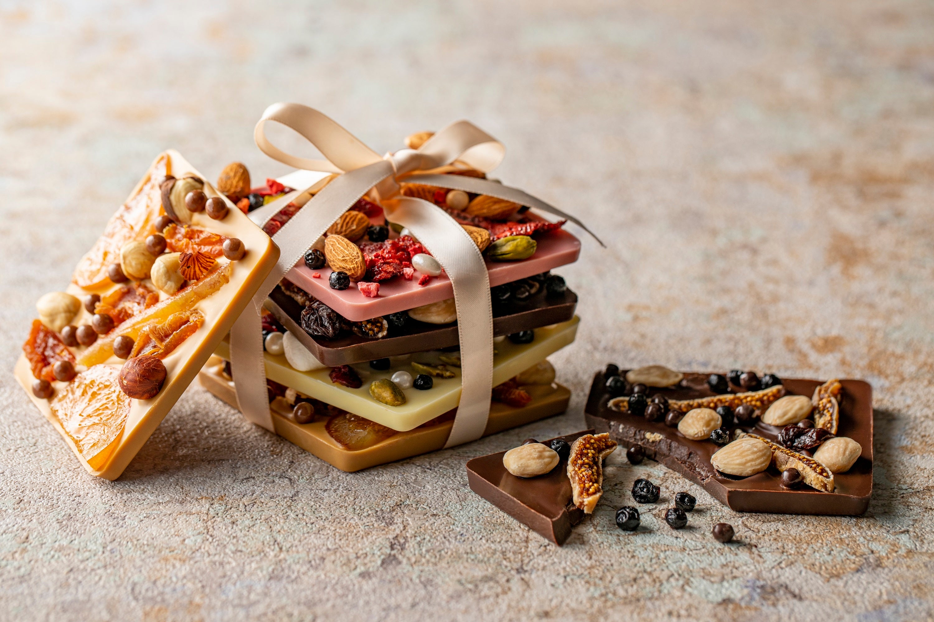 ウッディーなノートとジャスミンやオレンジを思わせるフローラル系の香りが特徴のヴァローナのブラックチョコレート、アルパコ66%とナッツのような香ばしさのカラク56%をブレンド。アーモンドの女王、スペイン産マルコナアーモンド、ドライ無花果、ドライクランベリー、ドライブルーベリーとサクッとした歯触りのパールクラッカンをトッピングしました。