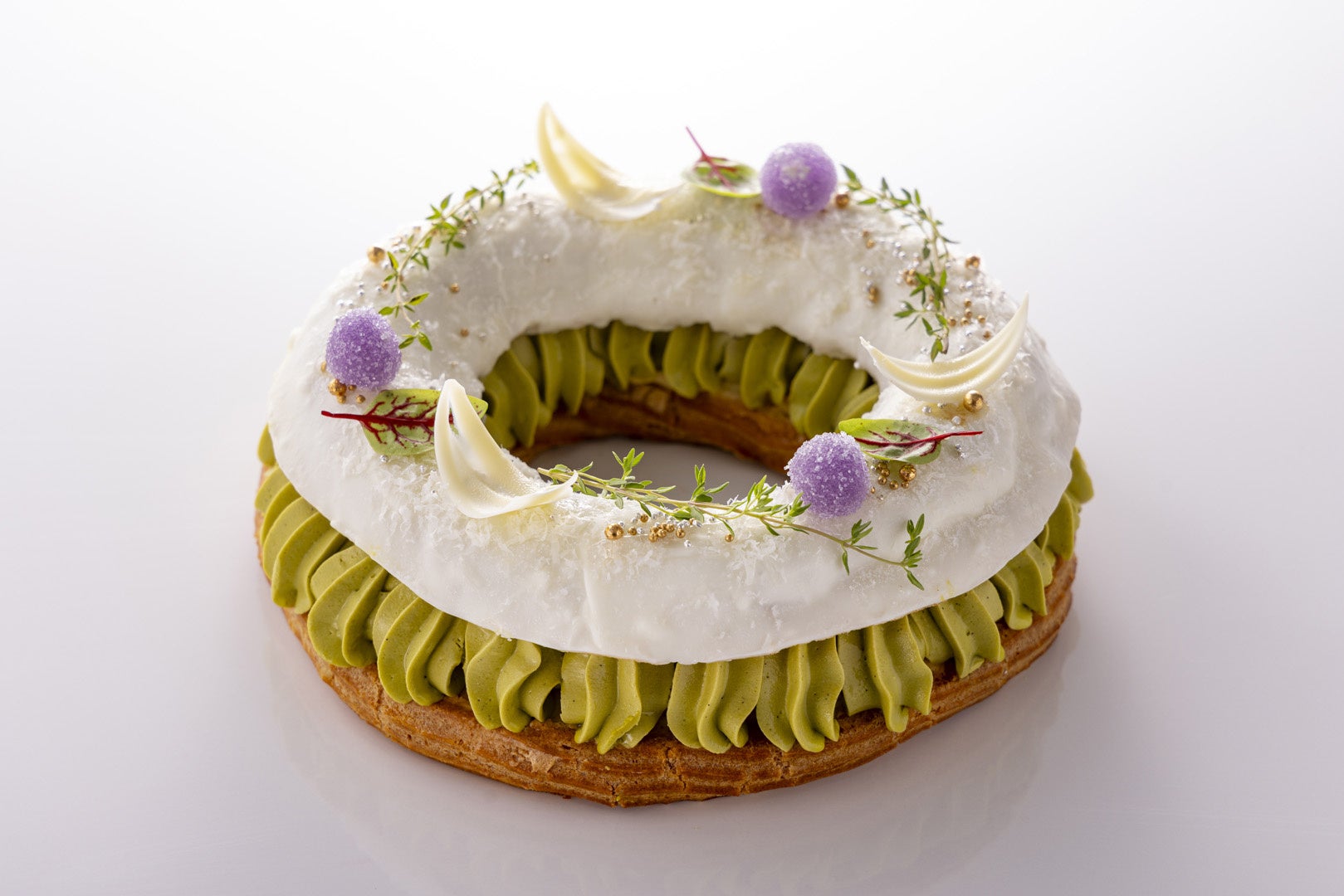 リング状のシュー生地にピスタチオ風味のクリームをたっぷり挟んだリッチな味わいのケーキを、クリスマスリース風に仕立てました。