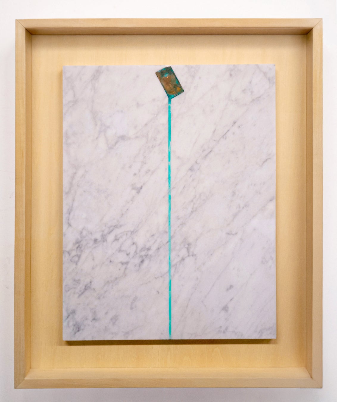 今回の新作は、大理石を主素材とし、銅・真鍮・鉄などの腐食性金属との組み合わせによって構成されています。金属の酸化によって生じる錆の色や染みが石の表面に沈着していく現象に着目し、それを意図的に定着させることで、自然現象と作家の意志が交差する“痕跡の彫刻”を立ち上げます。物質が変化するプロセスそのものを作品として提示することで、時間の蓄積や記憶、物質の消失などの可視化に成功しています。