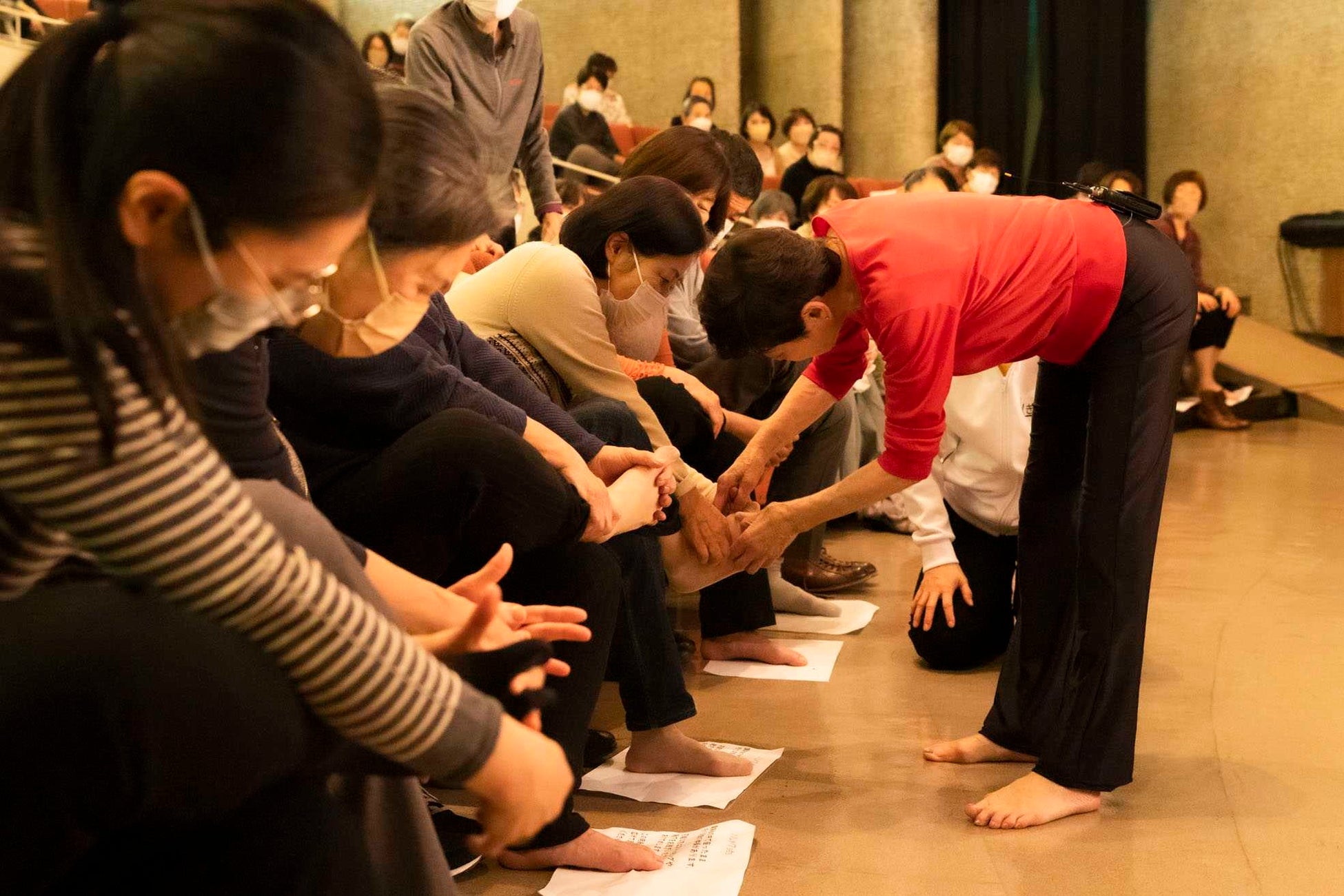 まずは椅子に座って前かがみになり、自分のお腹のお肉をつかむところから。「自分の体に、細胞に、まずはこうして意識を向けることが大事」ということで、「脂がのっていくのは、食べてるからじゃなくて動かしていないから」「グッとつかむの、脂身を!」と言った菊池先生の呼びかけに、参加者の皆さまは笑いながら実践されていました。その後は、足指の間に手指を5本すべて突っ込み足首をぐるっと回す体操。「指で踏ん張って歩くわけだから、ずっと自分の足で歩き続けるために、指をしっかり意識して動かさないとダメ」と、菊池先生自ら参加者の方の動きをしっかりチェックされながらのレクチャーがありました。