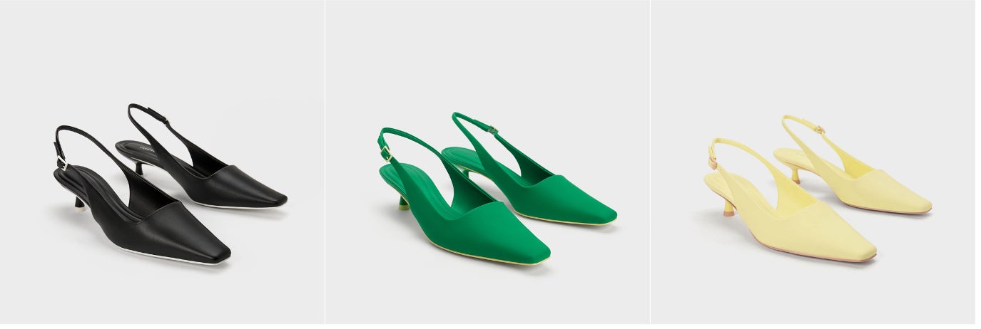 「Vita ヴィータ スクエアトゥスリングバックパンプス」は、キトゥンヒールのエレガントなシルエットにGreenやYellowといったボールドなカラーリングが特徴です。今回のビジュアルではITZYがアスレジャールックとあわせて、絶妙なバランスのコーディネートを披露しています。