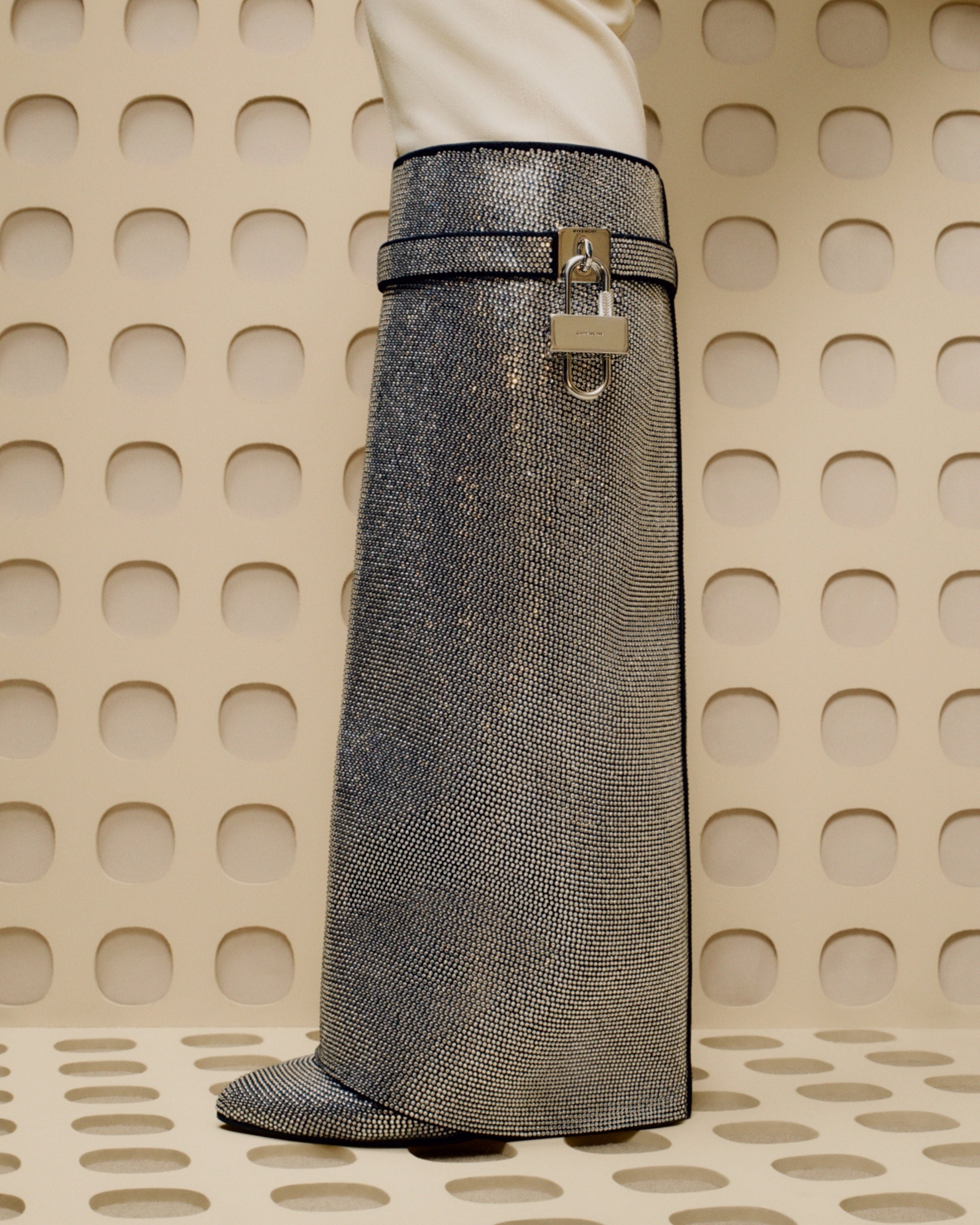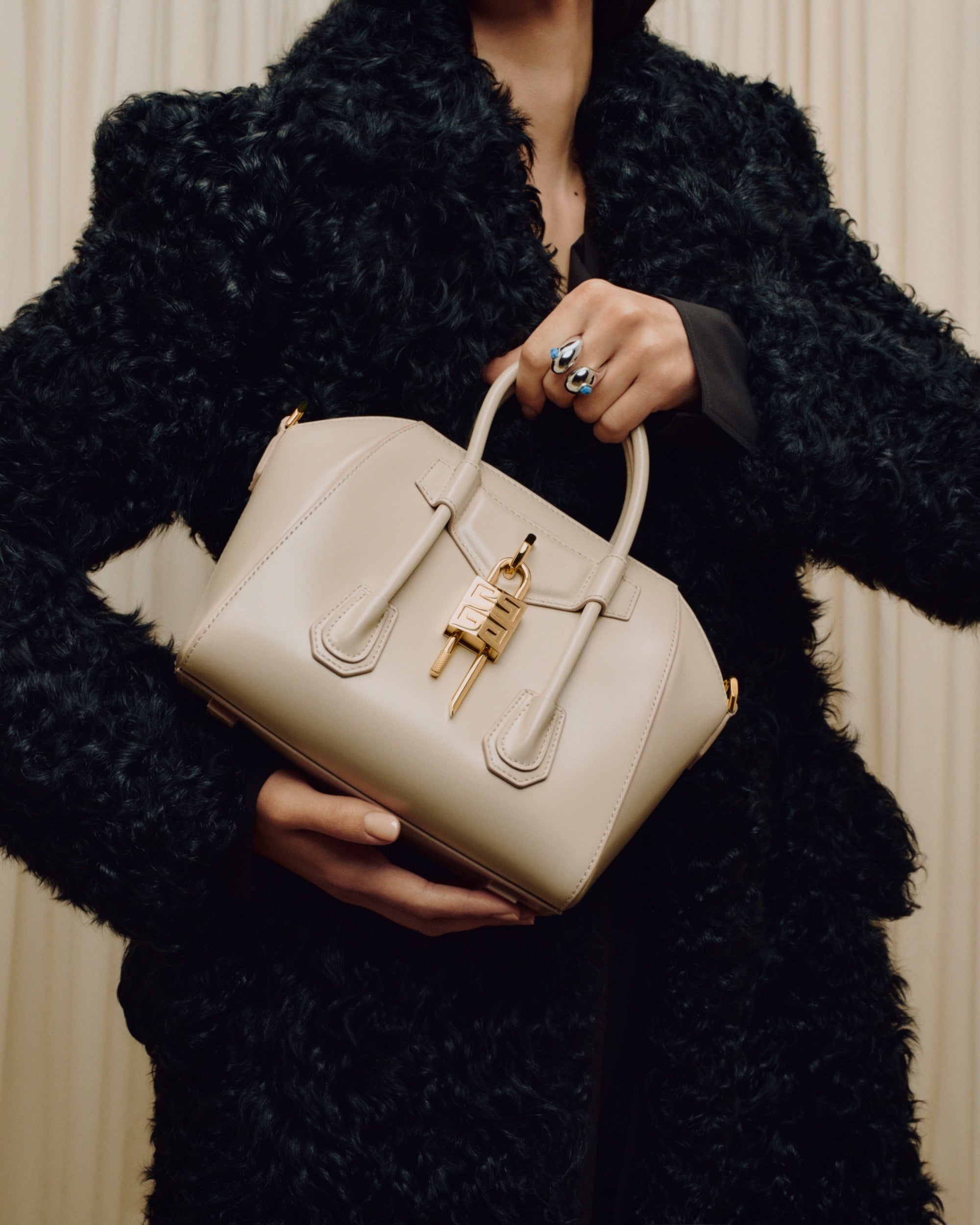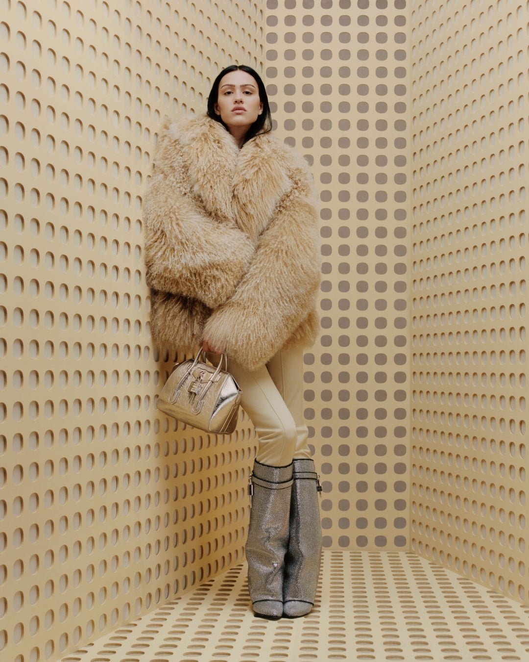 アウターウェアはテーラリングとテクスチャーの”二重の愛”を強調。メンズライクなレディスのオーバーコートや、ブラックのラムヘアやヌードカラーのモンゴリアン・シアリングにラヴァリエールのブラウス、スリムなパンツを合わせ、ゴールドベージュやメタリックの『アンティゴナ』『ヴォワイユー』バッグ、刺繍入りの『4G』バッグ、メタリックやクリスタルのパヴェが施されたシャークロックブーツ、揺れるパールのイヤリングなどが、ルックに輝きと質感をプラスします。