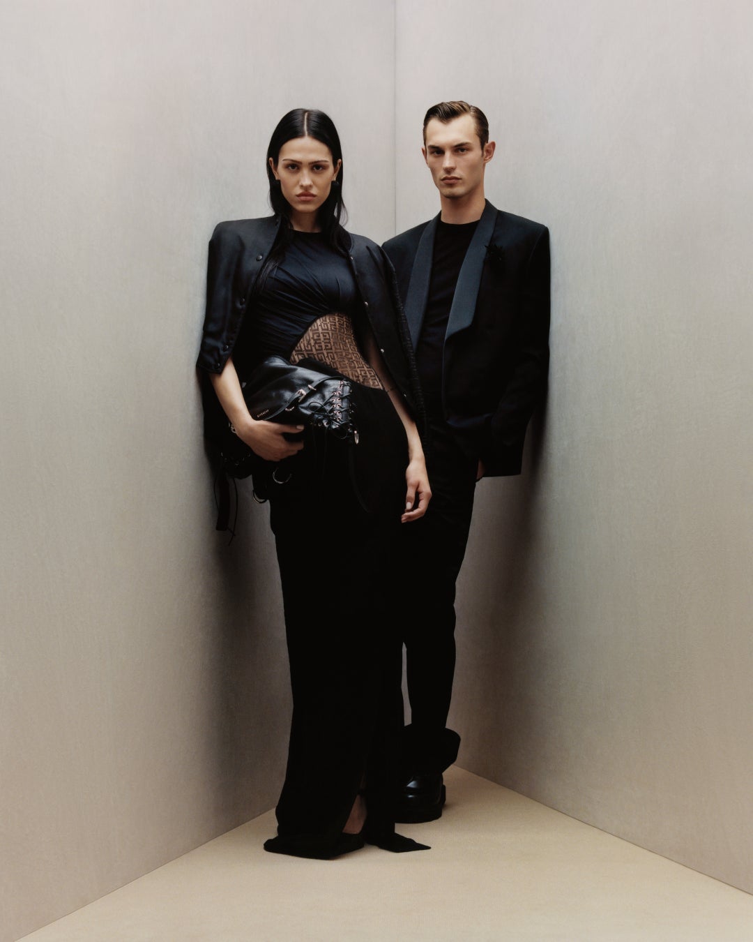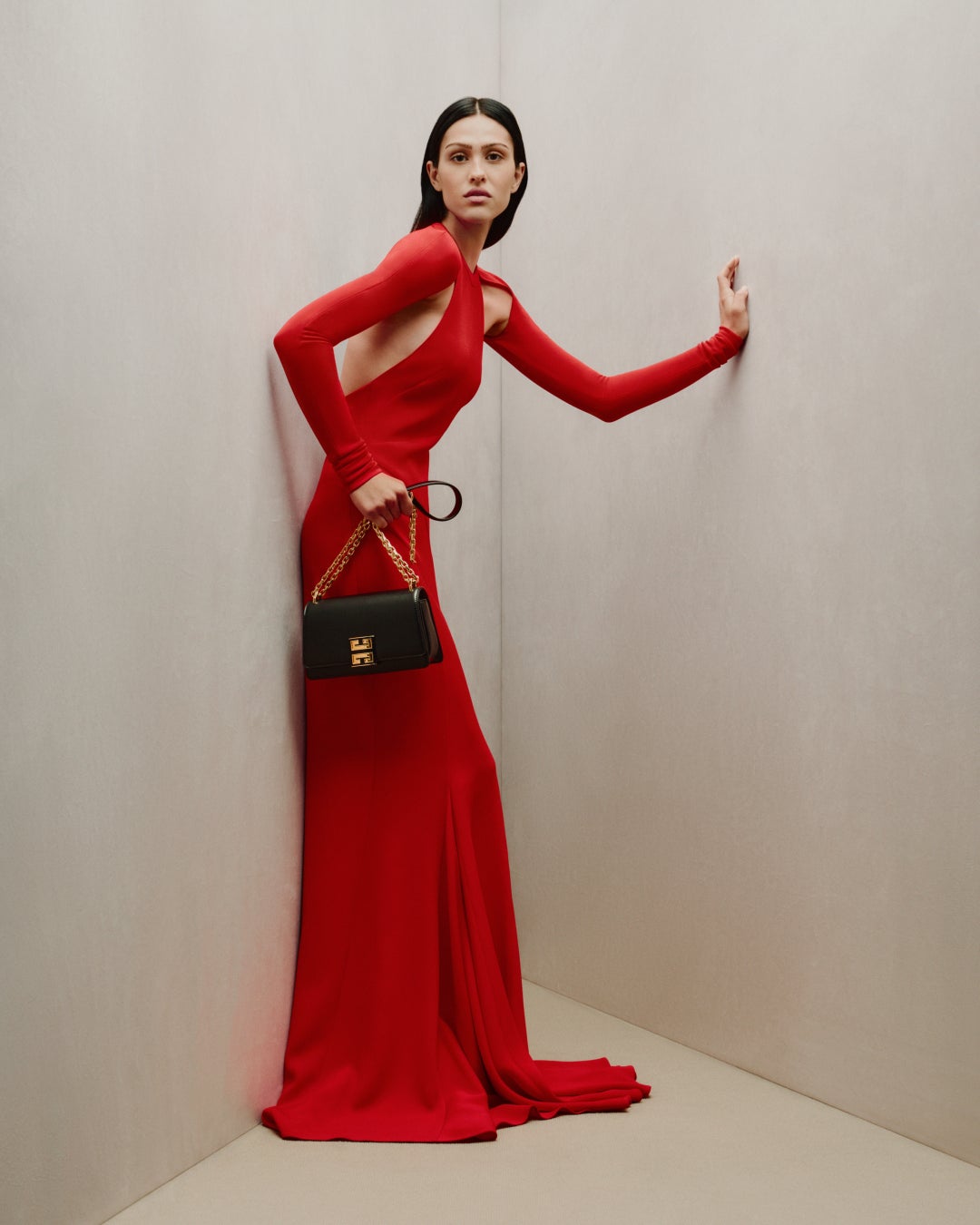 ウィメンズのルックは、創業者であるクチュリエ、ユベール・ド・ジバンシィの建築的なカッティングや、ノーブルな素材、ネガティブスペース(デッサンの余白部分)に対するウィットに富んだ遊び心に敬意を表しています。例えば、床まで届くほど長い流れるようなドレープを描くサテンジャージーのドレスは、”4Gプルメティ”の大胆でグラフィカルなインサートがアクセントに。キャディクレープ素材の赤いドレスは、メゾンのアーカイブからインスパイアされたホルターディテールのカットアウェイが特徴で、オープンバックには繊細なシルバーチェーンが揺れ動きます。スリップドレスはメゾンが誇るサヴォアフェールへのオマージュ。フレンチレースを折り畳んでシルクジョーゼットとつなぎ合わせ、高度な職人技と意外性のあるイレギュラーなネックラインを融合させています。