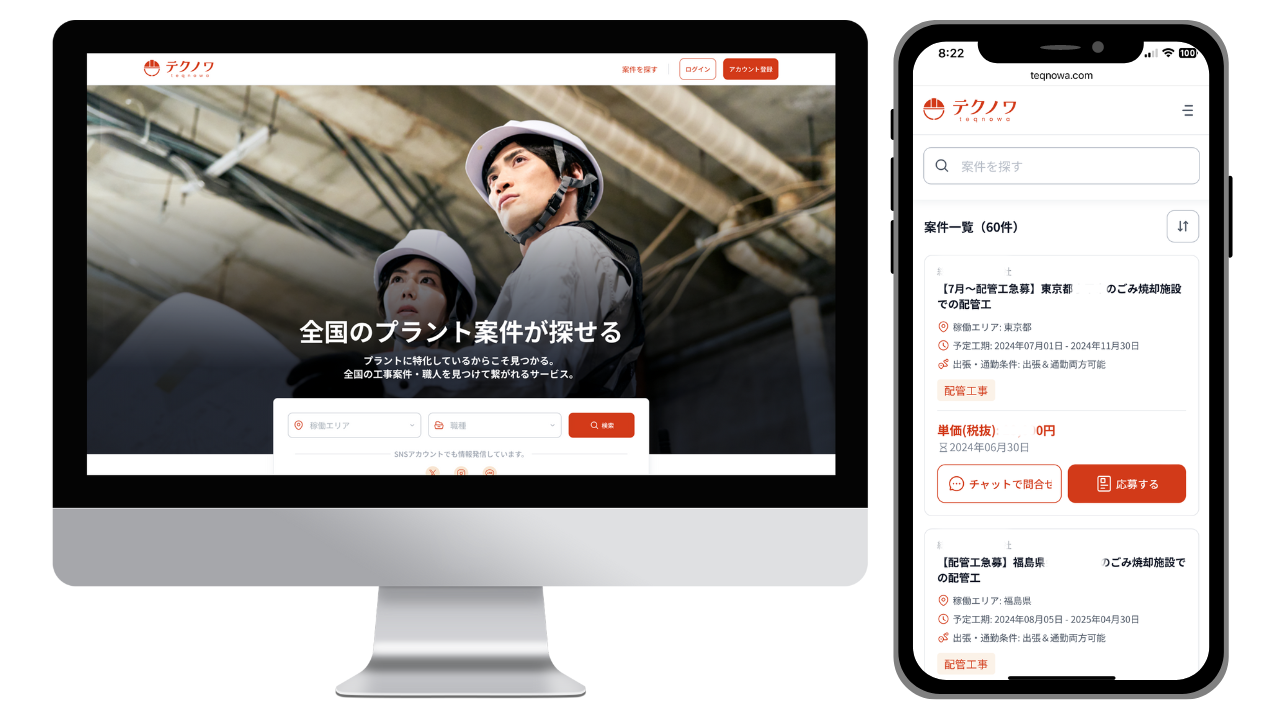 「テクノワ」のローンチまで何年にも渡り構想を固めていく中で、SNSを使った独自の戦略で全国のプラント工事会社や職人と繋がりをもち、案件マッチングためのビジネス検証を重ねてまいりました。その中でさらに「テクノワ」を利用していただくことによってユーザー獲得やマッチング成功率がアップしています。