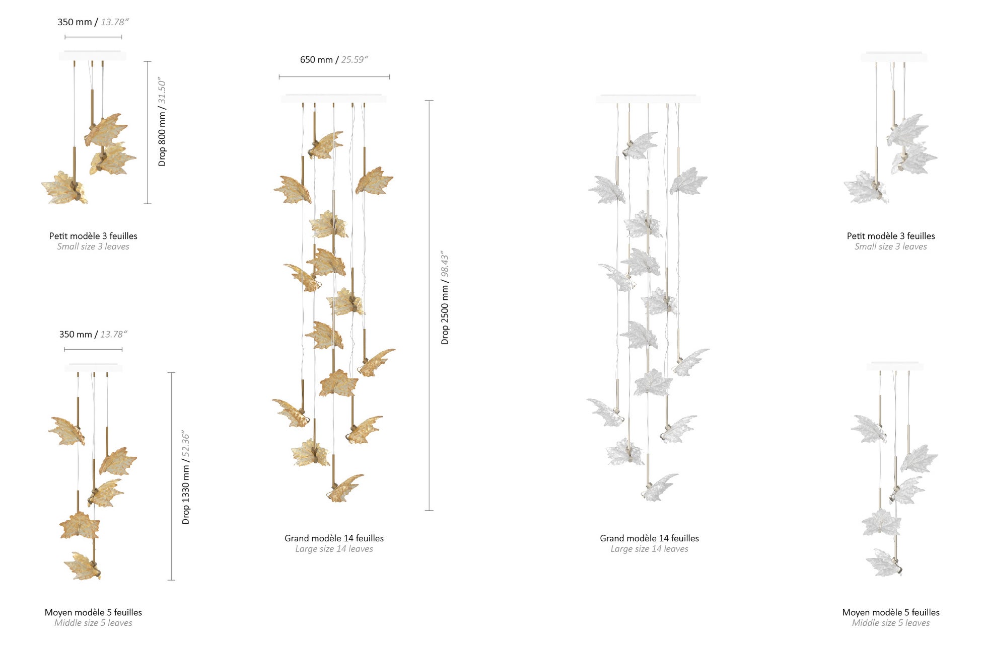 《シャンゼリゼ リアヌ》は、スタジオを代表するプロジェクトです。クリスタルの葉が舞い落ちる蔓(つる)のように、つたい生い茂る植物のように、モチーフの配置やアングルは環境によって異なります。あらゆるインテリアに適応するモジュール式照明へ変換されたアイコニックなクリスタルピースは、細部へのこだわりもユニークです。葉のコンポジションは、長さ、間隔、高さを拡張することができ、クリアとゴールドラスター、2種類のカラーが用意されています。展開はS(3リーフ)、M(5リーフ)、L(14リーフ)のバリエーションの他に、特注のクリエーションが可能です。