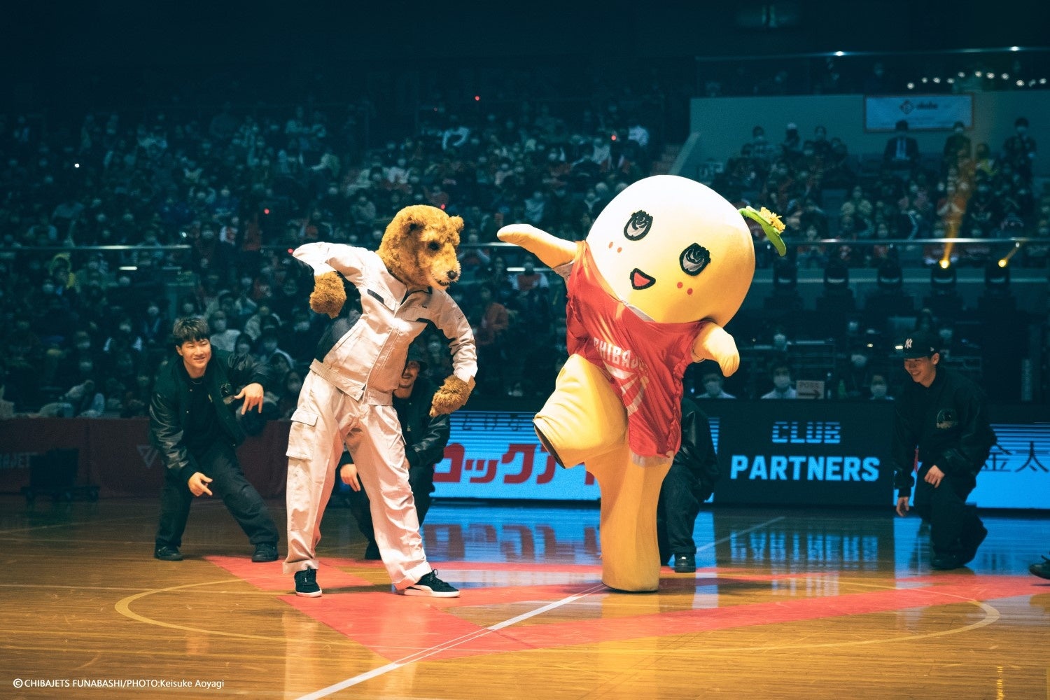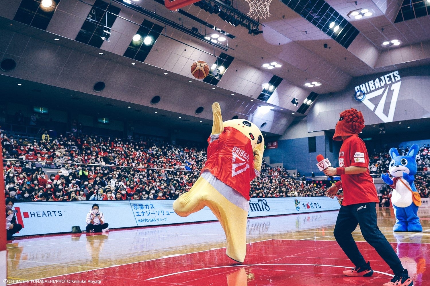 2日目のハーフタイムはSTAR JETSと一緒に「ぶぎぶぎふなっしー♪」を息の合ったコンビネーションでカッコよくパフォーマンスした後、京葉ガス Presents「ブースターフリースロータイム」のMCを担当したふなっしー。がすたんチームとジャンボくんチームに分かれてフリースローにチャレンジするブースターを全力で盛り上げ、アリーナ内が温かい雰囲気となった。