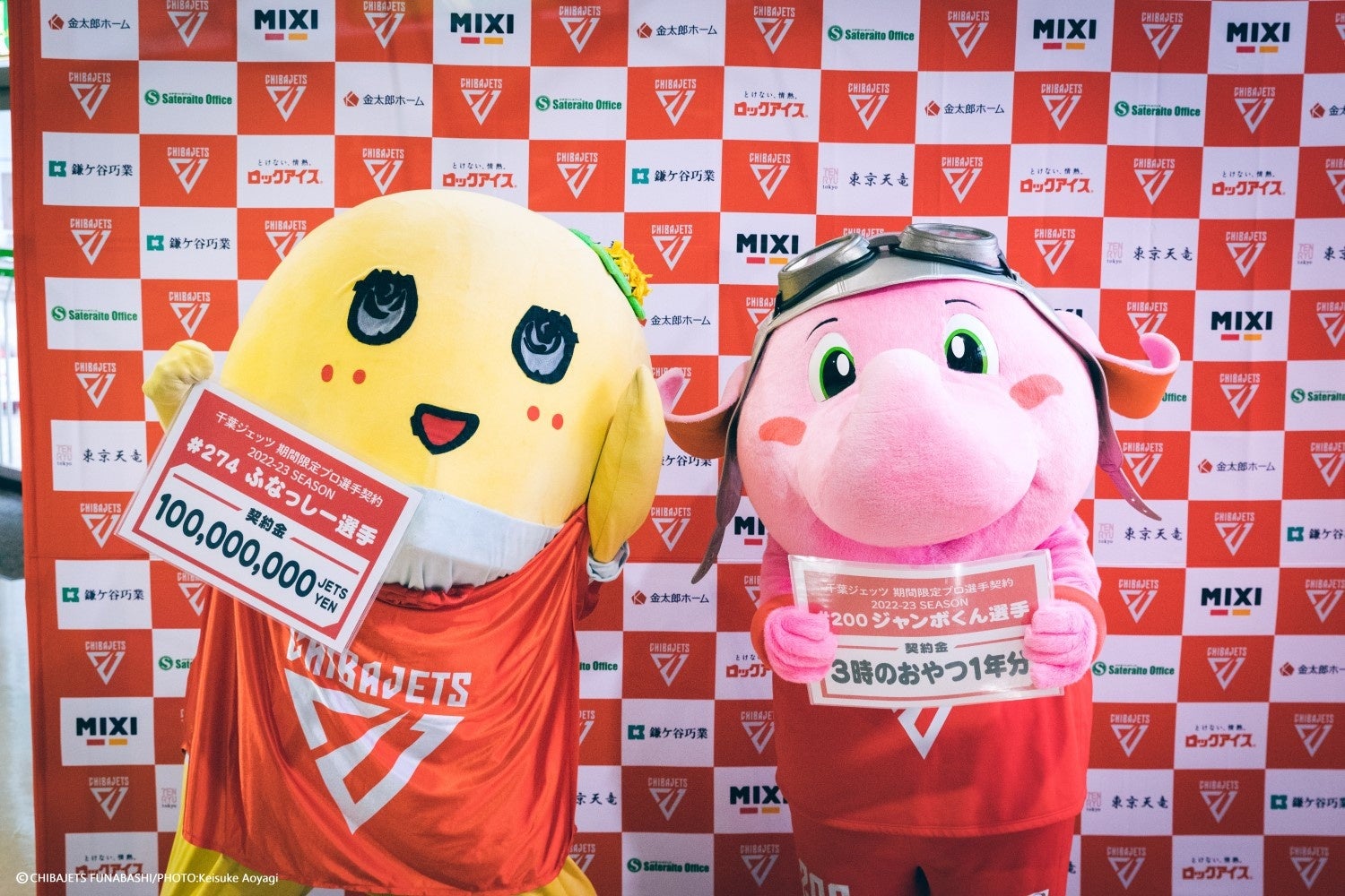 記者会見ではふなっしー、ジャンボくん共に4シーズン連続プロ選手契約をできた嬉しさを伝えた。1シーズン目の契約条件は「ふなっしー:梨274個、ジャンボくん:お菓子200個」2シーズン目は「ふなっしー:梨(特選)6個、ジャンボくん:お菓子の家セット」3シーズン目は、「ふなっしー:梨1年分(出来高払い)、ジャンボくん:お菓子1年分(出来高払い)」だったが、今シーズン「ふなっしー:100,000,000JETS円、ジャンボくん:3時のおやつ1年分」という過去最高の契約条件となり、梨界初の1億JETS円プレイヤーが誕生した。ふなっしーは最大の評価に驚きつつも「梨界初めての1億JETS円プレイヤーになれて嬉しいなっしー!!これは快挙だよね?初の1億でしょ?この評価にふさわしい活躍をするなっしー!ただ、1億って響きはアガるけど聞きなれない通貨のJETS円は円に換算すると価値はどれくらいなの?」というコメントを語った。ちなみに1億JETS円の価値は為替の影響を受け、現在は「梨1年分ぐらいの価値」と説明があると「昨シーズンと変わってねーじゃねーか!!笑」とツッコミ、会場を笑わせた。