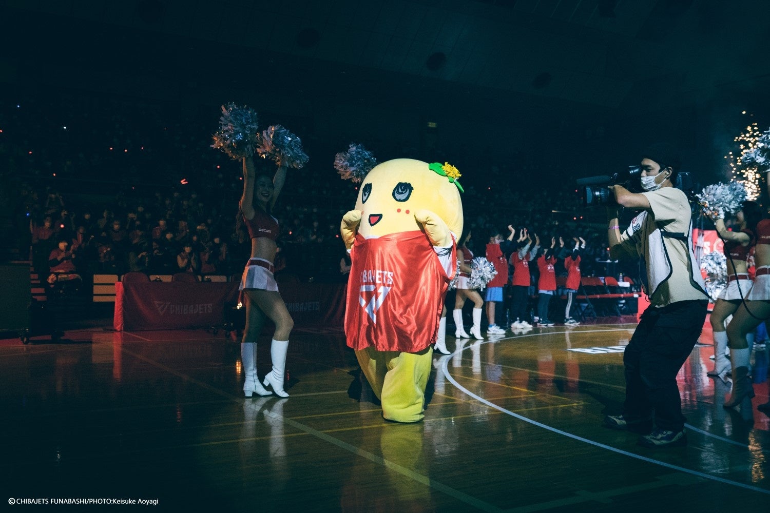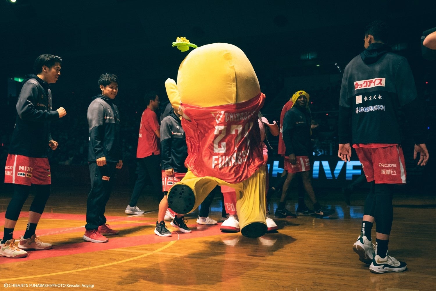 試合前に開催されるエンターテインメント演出「オープニングフライト / 選手入場」に出場。選手、ジョンHCと共に「期限付きプロ契約選手 #200ジャンボくん、#274ふなっしー」とコールをされ、コート上に登場。選手との記念撮影参加に加えて、ハドル(円陣)にも参加し、チームの一員として勝利を誓い合った。富樫選手が首元にふなっしーのぬいぐるみを入れたり、クリストファー・スミス選手がふなっしータオルを被って登場したりとウェルカムムード満載の選手入場となった。