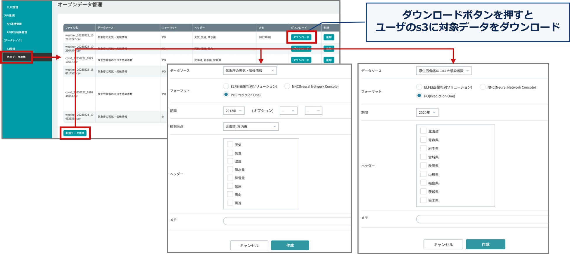 今回のアップデートでは、「マネージドクラウド with AWS」のポータル上で、過去の気象庁の天気情報や厚生労働省の新型コロナウイルスの感染者数の期間やロケーションなど、必要なデータを指定すると、ユーザーのAmazon S3に送信できるインターフェースを設けました。これにより、ユーザーがオープンデータを簡単に利用することができ、自社保有のデータと組み合わせて予測分析が可能になるため、予測精度の向上が期待できます。