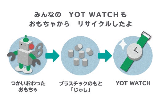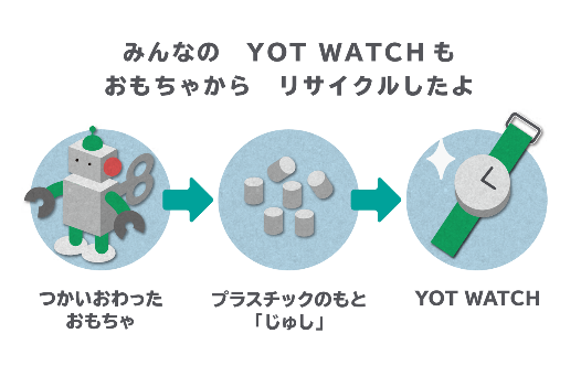 YOT WATCHは、子どもたちが使っていたプラスチックのおもちゃを回収・リサイクルして作られた腕時計。