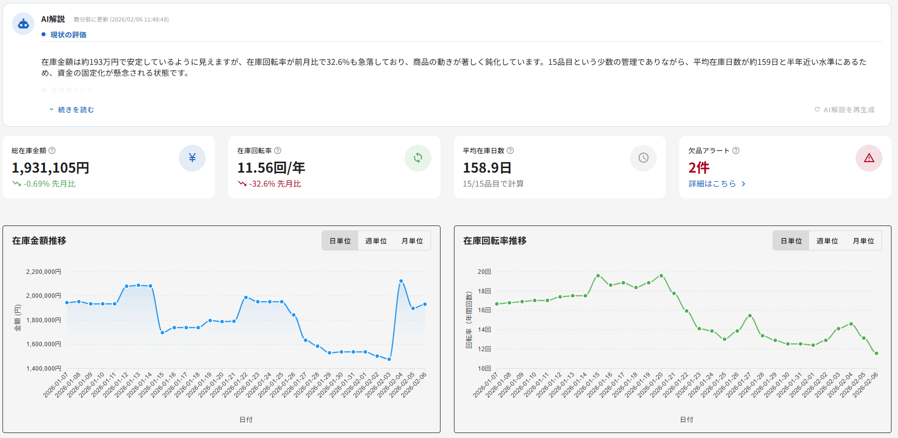 在庫金額や回転率の推移は、棒グラフや折れ線グラフで視覚化されます。これにより、季節変動の把握や、施策による改善効果の確認が誰でも簡単にできるようになります。