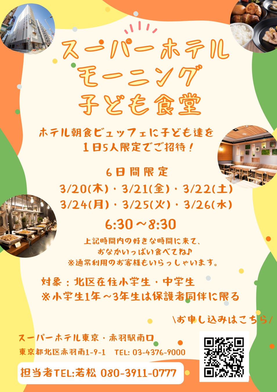 「Natural, Organic, Smart」をコンセプトに国内173店舗のホテル運営を⼿掛ける株式会社スーパーホテル(所在地:大阪府大阪市、代表取締役社長:山本健策)は、2025年3月20日(木)~2025年3月26日(水)(3月23日(日)を除く)の期間中、東京都北区のスーパーホテル東京・赤羽駅南口でホテル朝食ビュッフェに北区在住の小学生・中学生を無料で招待する「モーニング子ども食堂」を初めて開催しました。