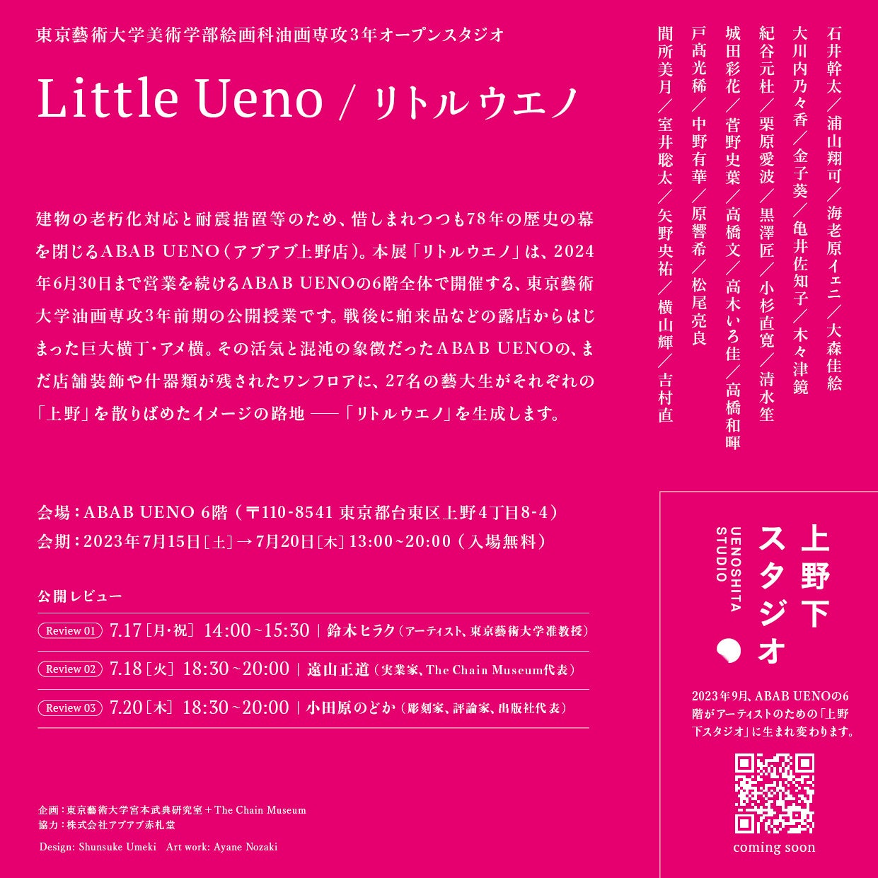 秋の正式なスタジオの開設に先駆けて、上野にキャンパスを構える東京藝術大学美術学部絵画科油画専攻の演習(宮本武典研究室)と連携したオープンスタジオ「リトルウエノ」を開催します。