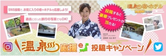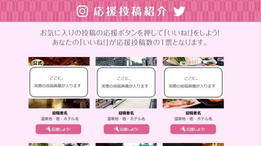 本企画は、TwitterもしくはInstagramで「#温泉応援」など指定のハッシュタグをつけて、国内の温泉宿・ホテルについて投稿をすることで、オリジナル宿泊券が当たるキャンペーンです。投稿は「また行きたい!」「いつもありがとう」「みんなにおすすめ」など、過去に訪れた温泉宿・ホテルへの内容も対象で、今回オープンした「温泉応援」サイトにそれらがまとめて掲載されるため、次回の温泉旅行の行き先や宿泊先を決める際の参考としても、活用することもできます。なお、サイトに掲載する投稿は、事務局にて事前に確認を行うため、広告目的の投稿などが除外された『一般の方の投稿による温泉宿・ホテルの情報サイト』として閲覧することが可能です。