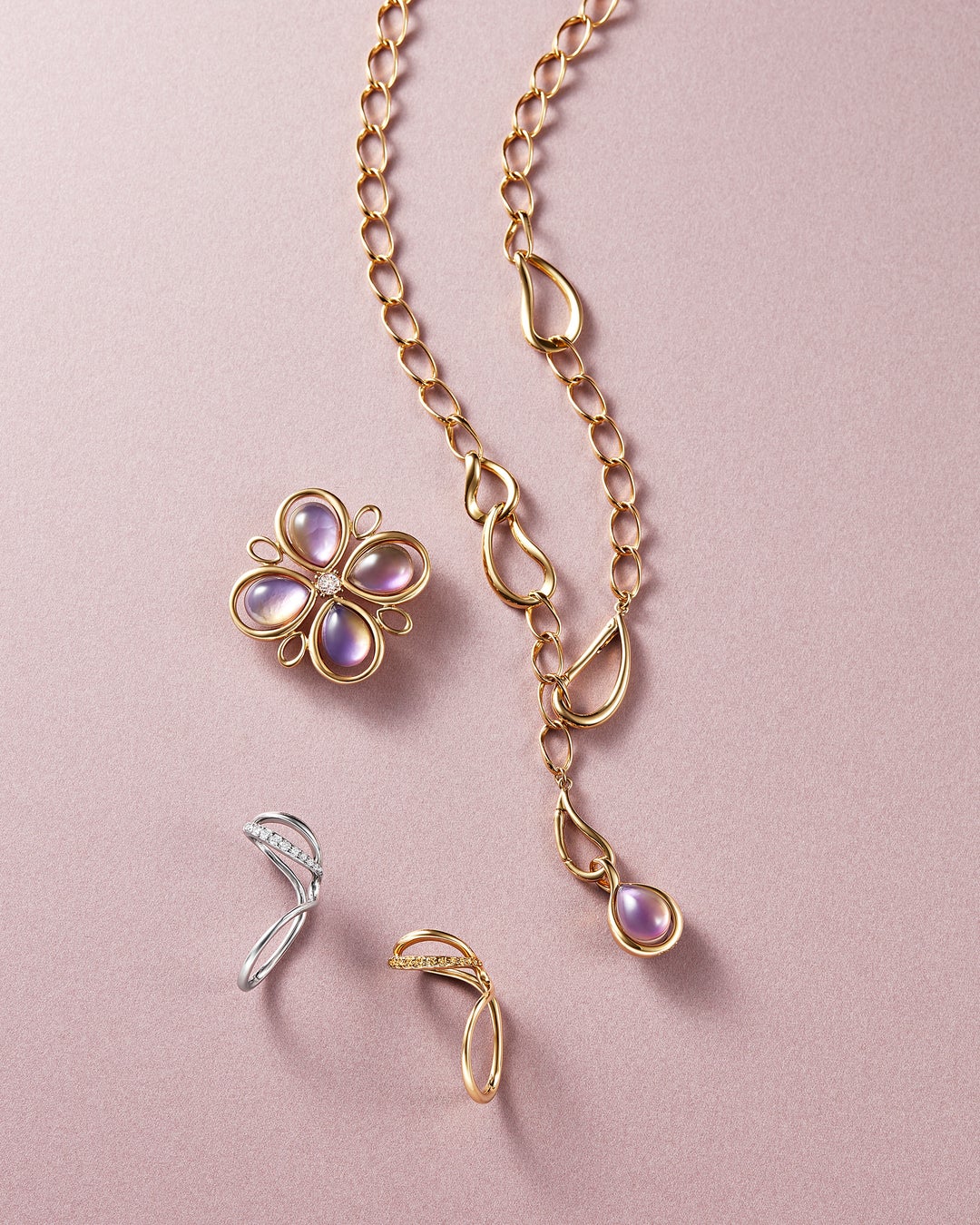 ネックレス(上) 48,400/ネックレス(下) 30,800/ブレスレット 15,400/リング 22,000/イヤーカフ 17,600