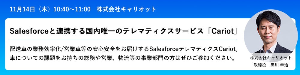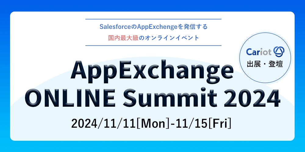 株式会社キャリオット(本社:東京都港区、代表取締役社長 齋藤 洋徳)は、株式会社ネクプロが主催する、SalesforceのAppExchangeを発信する国内最大級のオンラインイベント「AppExchange ONLINE Summit 2024」において、車両動態管理システム「Cariot」を出展し、登壇することをお知らせします。