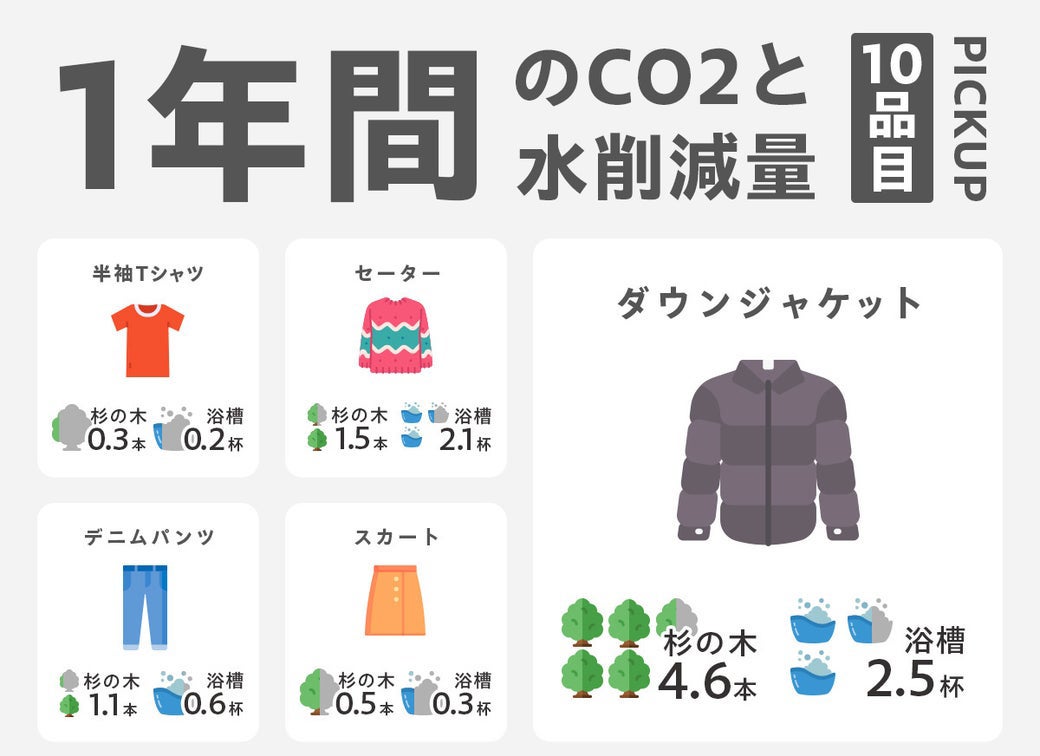 315品目の衣料品・生活用品について、1品目あたりのCO2と水の削減値を算出しました。