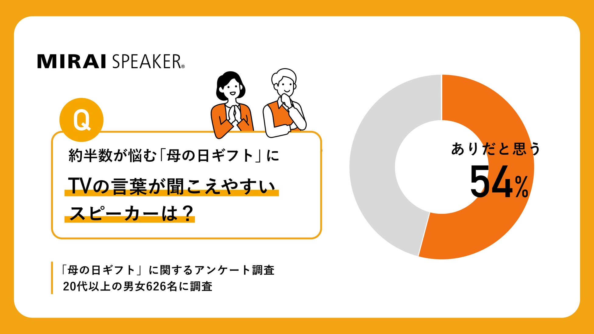 ・ 「テレビの言葉がはっきり聞こえるようになるスピーカー」について、母の日のギフトとして半数以上が「ありだと思う」と回答。親世代が50代以上になる30代以上の年代で需要が高まりつつあることがわかった