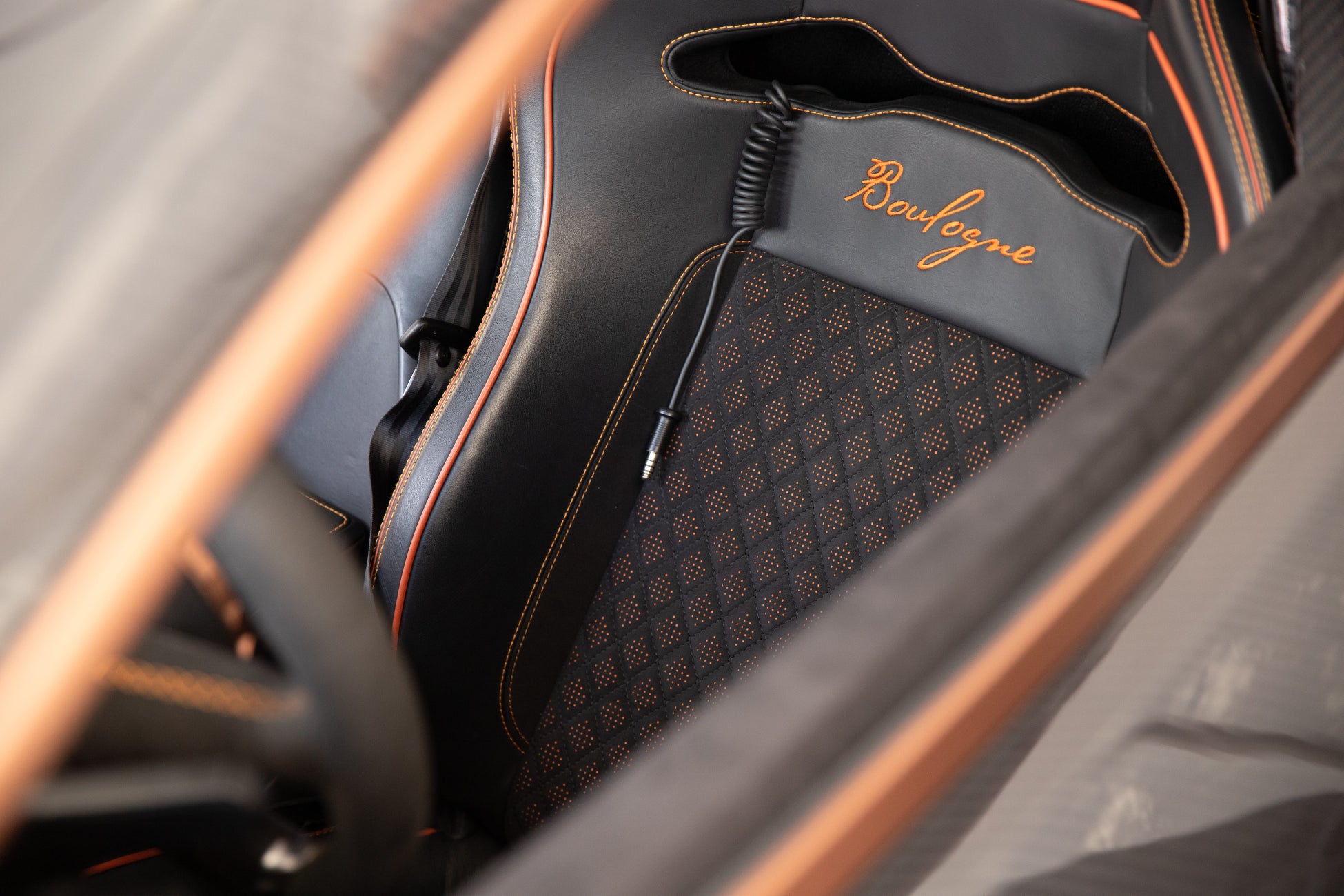 この電動ハイパーカーは、大胆なデザインとスポーティなキャラクターを兼ね備え、シートとドアパネルの中央には黒のパンチングが施されたALCANTARA®のオレンジ色の裏地と、ステアリングホイールとダッシュボードに黒のALCANTARA®が使用され、独自性と高品質を際立たせています。