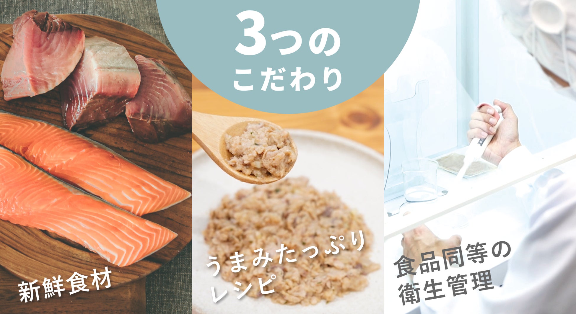 私たち人間が食べるものと同じ鮮度・グレードの食材を使用。新鮮食材を猫の特性に合わせ試行錯誤を重ねて独自の基準で調理製造を行い、レトルトながらも冷凍タイプ同様のおいしさを実現。