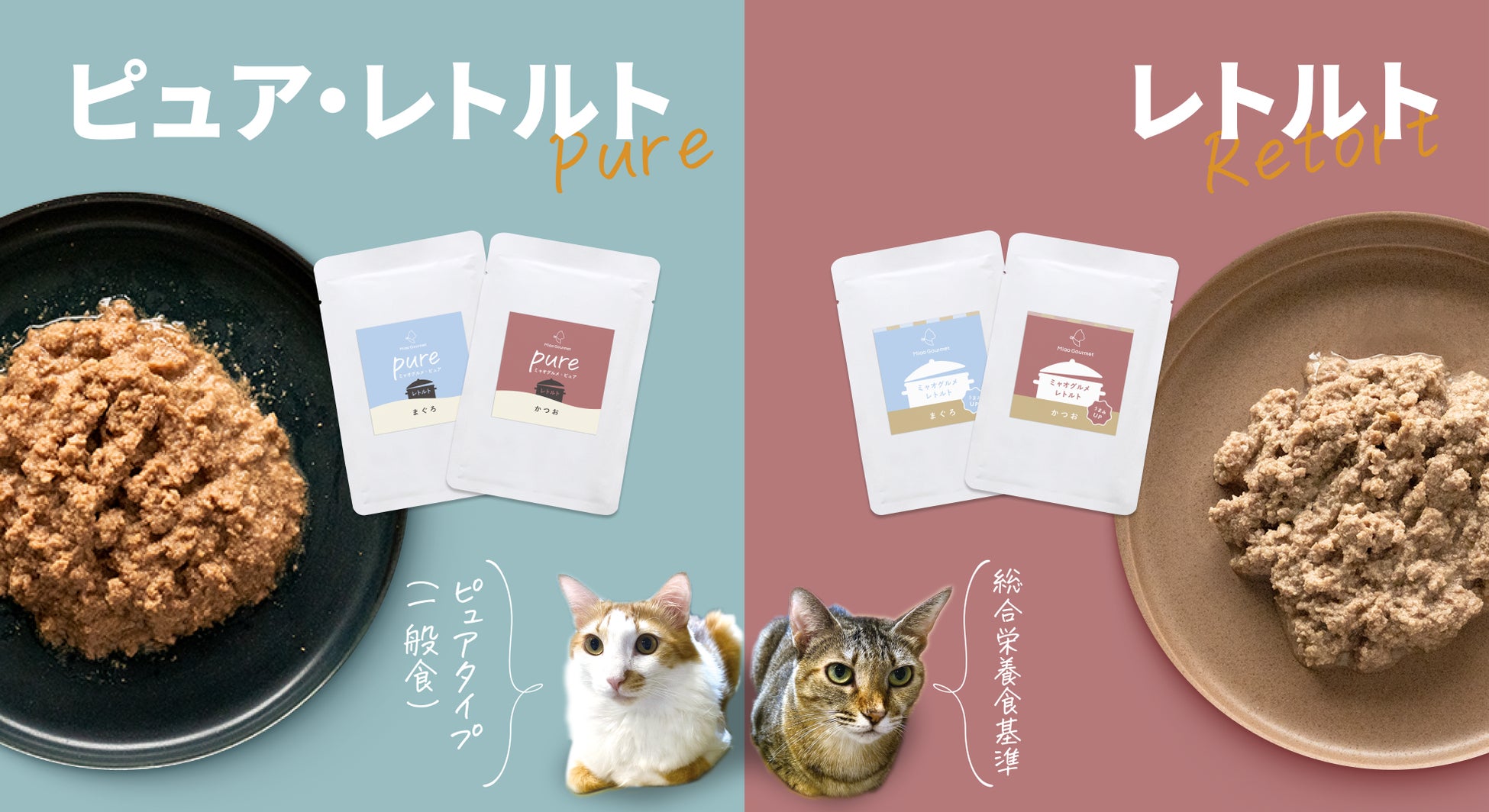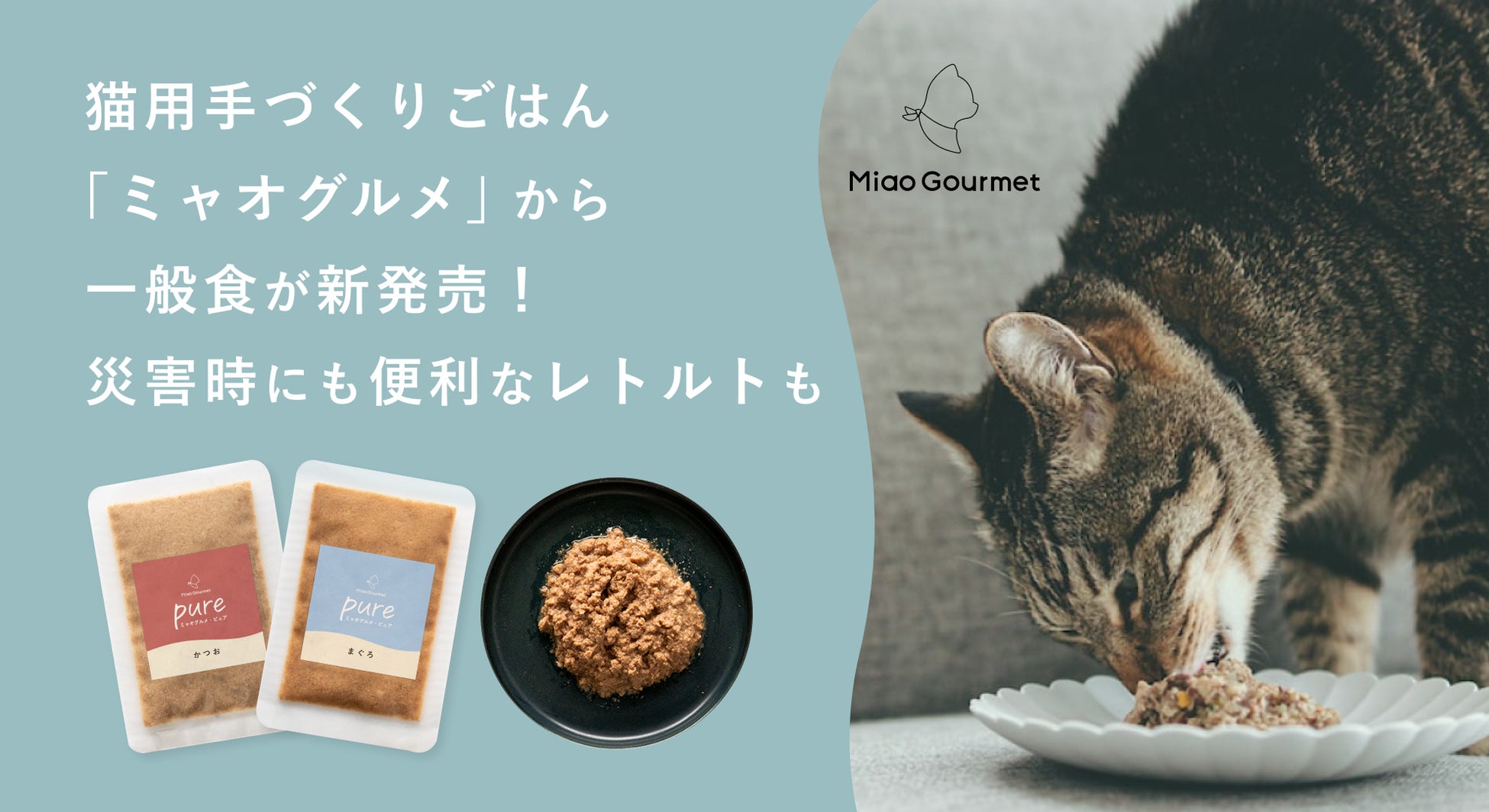 また、「解凍出来ない時にすぐにあげられるごはんが欲しい」「防災時にもストックできるフードが欲しい」というお客さまの声をいただいたことから、より便利で災害時の備蓄にも役立つレトルトタイプの総合栄養食基準「ミャオグルメ・レトルト」、一般食「ミャオグルメ・ピュア・レトルト」も同時発売いたします。