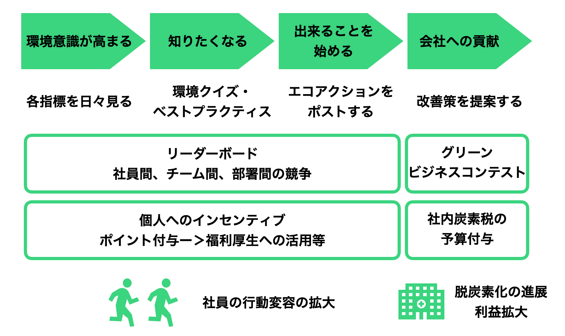 これらの仕組みにより、企業の脱炭素化を従業員主導で引き起こすことを狙います。