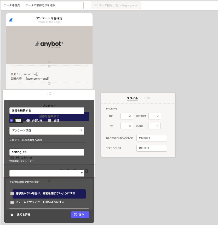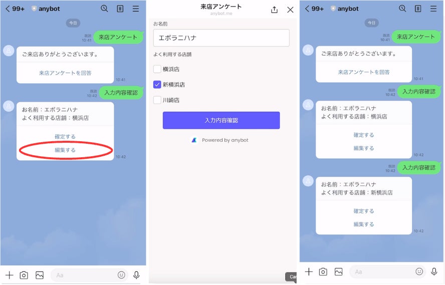 開発の背景anybotでは2種類の自動応答が可能です。一つはLINE公式アカウントのトークルームで一問一答を行う「会話フロー」。もう一つはアンケート方式の「ミニアプリ」です。従来はミニアプリに記入した内容を修正するのに以下の手順が必要で、画面遷移が生じていました。