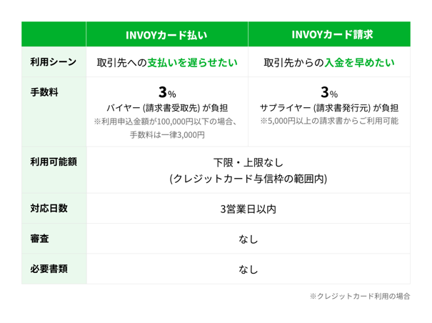 ※3 ユーザーが、受け取った請求書を「INVOYカード払い」でクレジットカード決済した場合。利用するクレジットカードの支払いスケジュールによって、後ろ倒しできる日数は異なります。