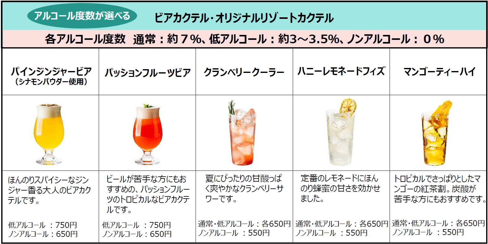 定番ビールのほか、3段階のアルコール度数が選べる南国感あふれるリゾートカクテルも