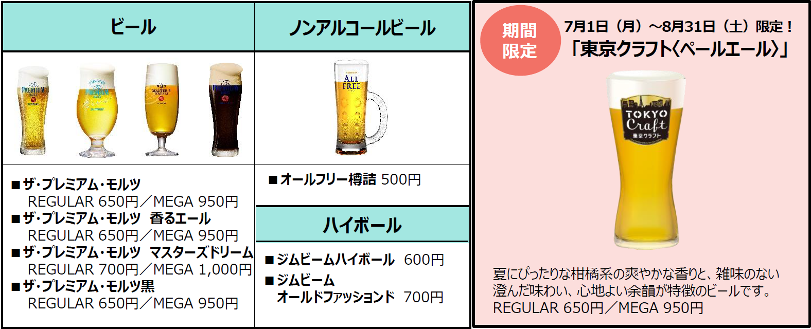 注ぎたてのビールは定番のほか、サマーシーズン限定の商品も登場します。ビアカクテル、オリジナルリゾートカクテルは低アルコールやノンアルコールも選択でき、お客さまの好みや気分によってアルコールの強さが選べます。