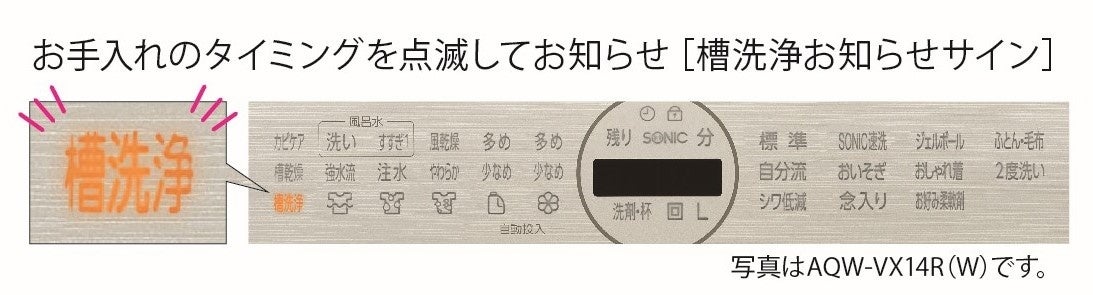 洗濯槽は底までステンレス(※11)で、清潔性を高めました。運転回数をカウントし、槽洗浄が必要なタイミングは表示部のサイン点滅でお知らせします。