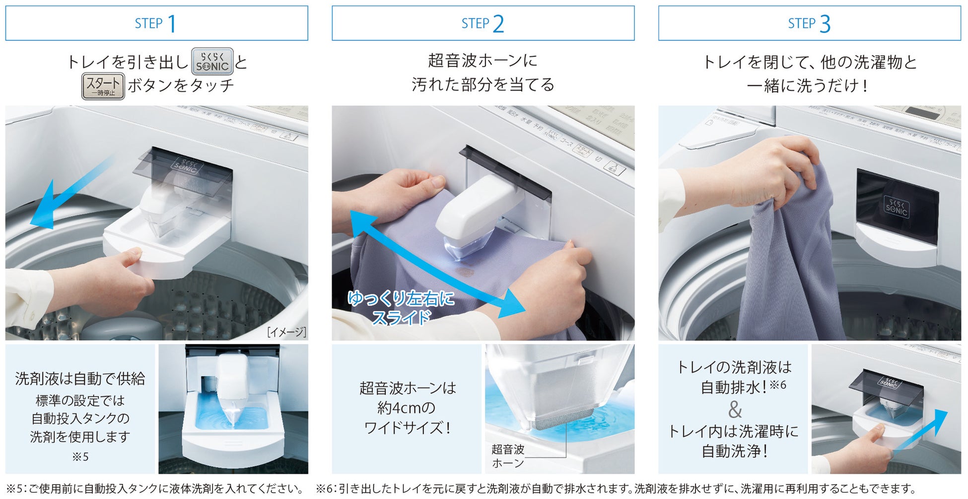 洗濯槽上の中央から内蔵のトレイを引き出し、超音波ホーン(先端)に汚れた部分を軽く押し当てながら、約30秒(※2)左右に動かすだけで、黄ばみの原因となるしつこい皮脂汚れや食品の汚れなどを浮かせて弾き出します。