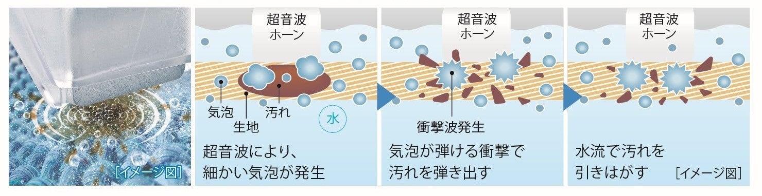 超音波ホーンの毎秒約4万回の振動により、キャビテーションが発生。気泡が弾ける衝撃で汚れを弾き飛ばします。
