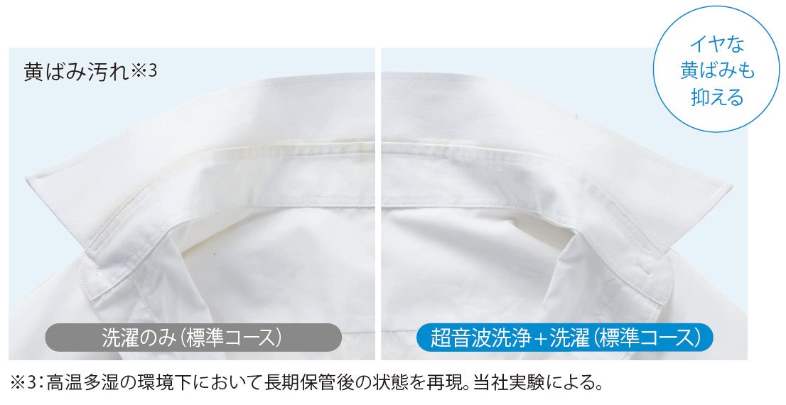 普段の洗濯だけでは繊維の奥に皮脂汚れが蓄積することがあります。それが原因で長期保存の間に“黄ばみ汚れ”になってしまうことも。超音波洗浄なら、そんな黄ばみも抑制します。