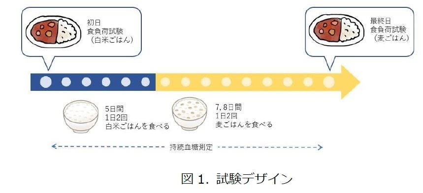 対象者は、初日に白米ごはんを負荷食とした食負荷試験(3)を行い、その後5日間は1日2食白米ごはんを食べてもらい、続く7または8日間は1日2食の麦ごはんを食べてもらいました。血糖値の変動は持続血糖測定器(4)(Freestyleリブレ・アボット社製)で観察しました。