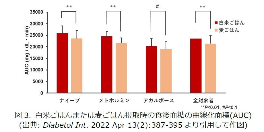 ・食後血糖の曲線下面積(AUC)では麦ごはんの摂取によりナイーブ群、メトホルミン群で低下、アカルボース群で低下傾向