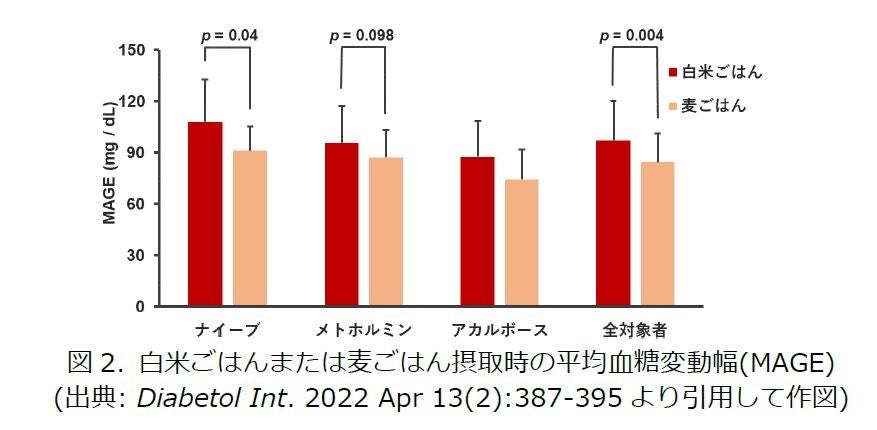 血糖変動の指標の一つである平均血糖変動幅(Mean amplitudes of the glucose excursions: MAGE)(5)は全対象者とナイーブ群で麦ごはん摂取時に低下、メトホルミン群で低下傾向が認められました。アカルボース群では平均値では低下していましたが、有意差はありませんでした。(図2)