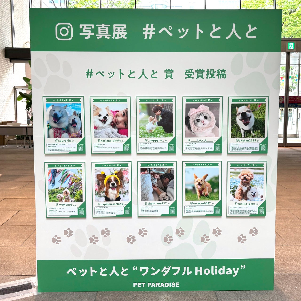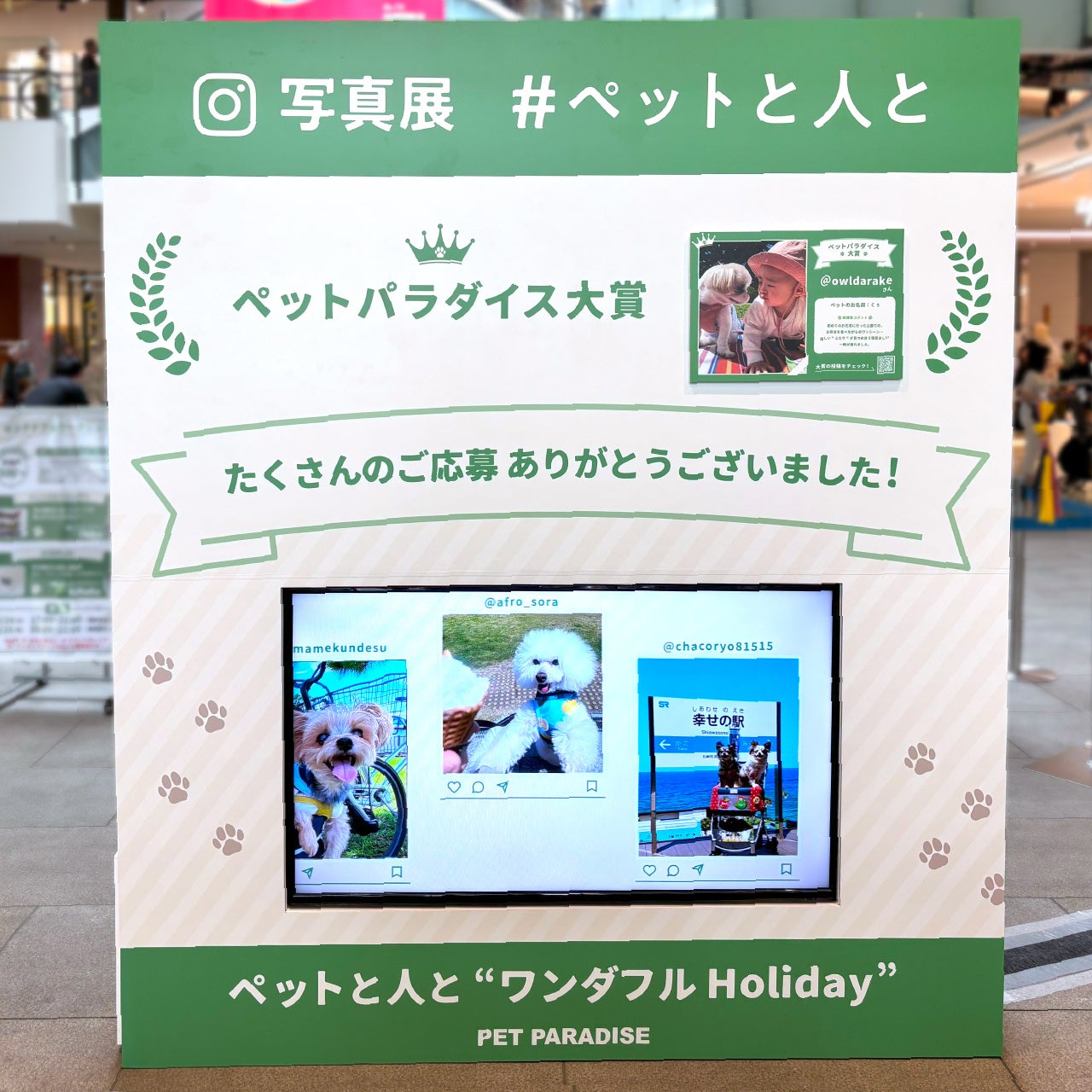 “よろこんでいるペット”をテーマにインスタグラム投稿キャンペーンで応募された作品を展示しました。入賞作品11点(ペットパラダイス大賞1点、#ペットと人と賞10点)をパネル展示・応募作品約300点をモニターで紹介しました。