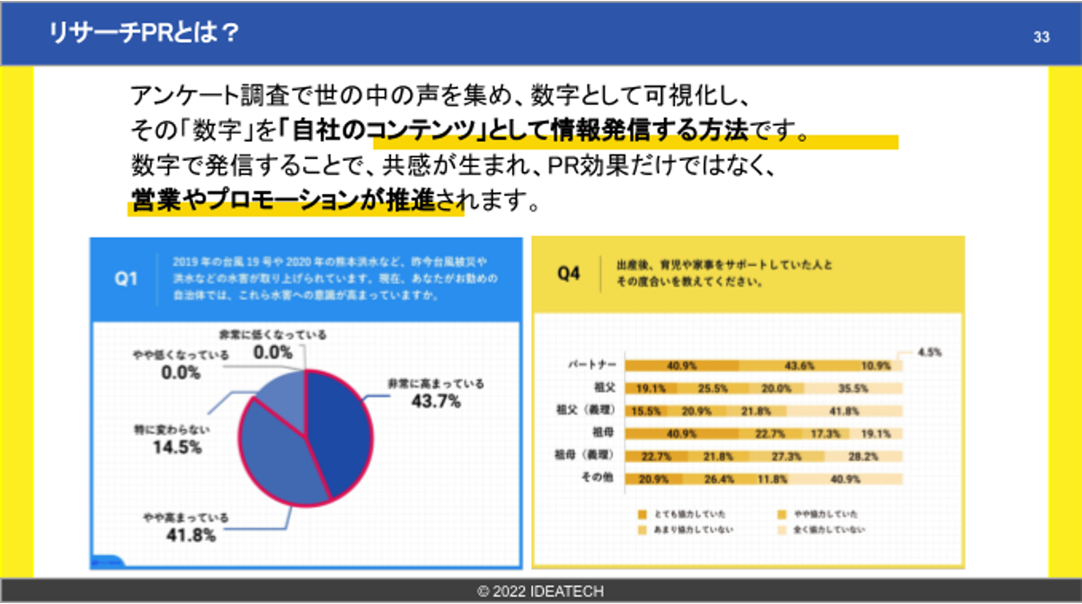 弊社は、クイックなアンケート調査で裏付けを取り、リサーチ結果をPRするワンストップサービスとして「リサピー®︎」を提供しています。その中で、100社を超える企業様のPR・マーケティング領域での「調査(リサーチ)」企画に携わり、マーケティング・PRとしての「調査(リサーチ)」の有効性を実感しております。