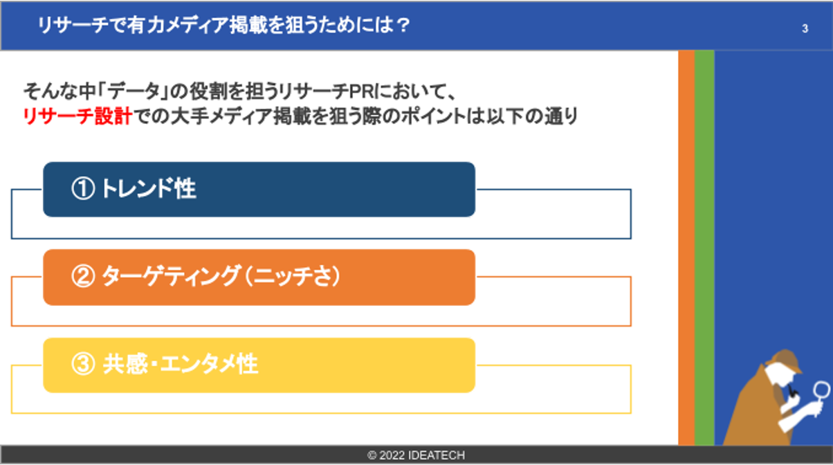そんな中で、PRという文脈においては、リリースした「調査(リサーチ)」が、「日経新聞」などの大手媒体に掲載されることの効果は非常に高く、大手媒体に掲載いただけるかどうかが1つのわかりやすい効果の成果指標となるのも事実です。