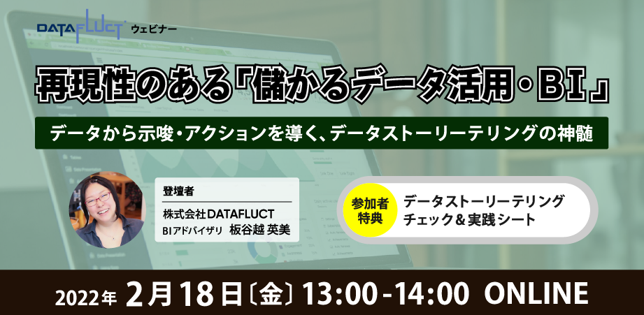 データサイエンスで企業と社会の課題を解決する株式会社DATAFLUCT(本社所在地:東京都渋谷区、代表取締役:久米村 隼人)は、データから示唆を得た後にとるべきアクションを学べるウェビナー『再現性のある「儲かるデータ活用・BI」~データから示唆・アクションを導く、データストーリーテリングの神髄~』を2022年2月18日(金)13時からオンラインで開催します(14時終了予定、視聴無料、要事前登録)。