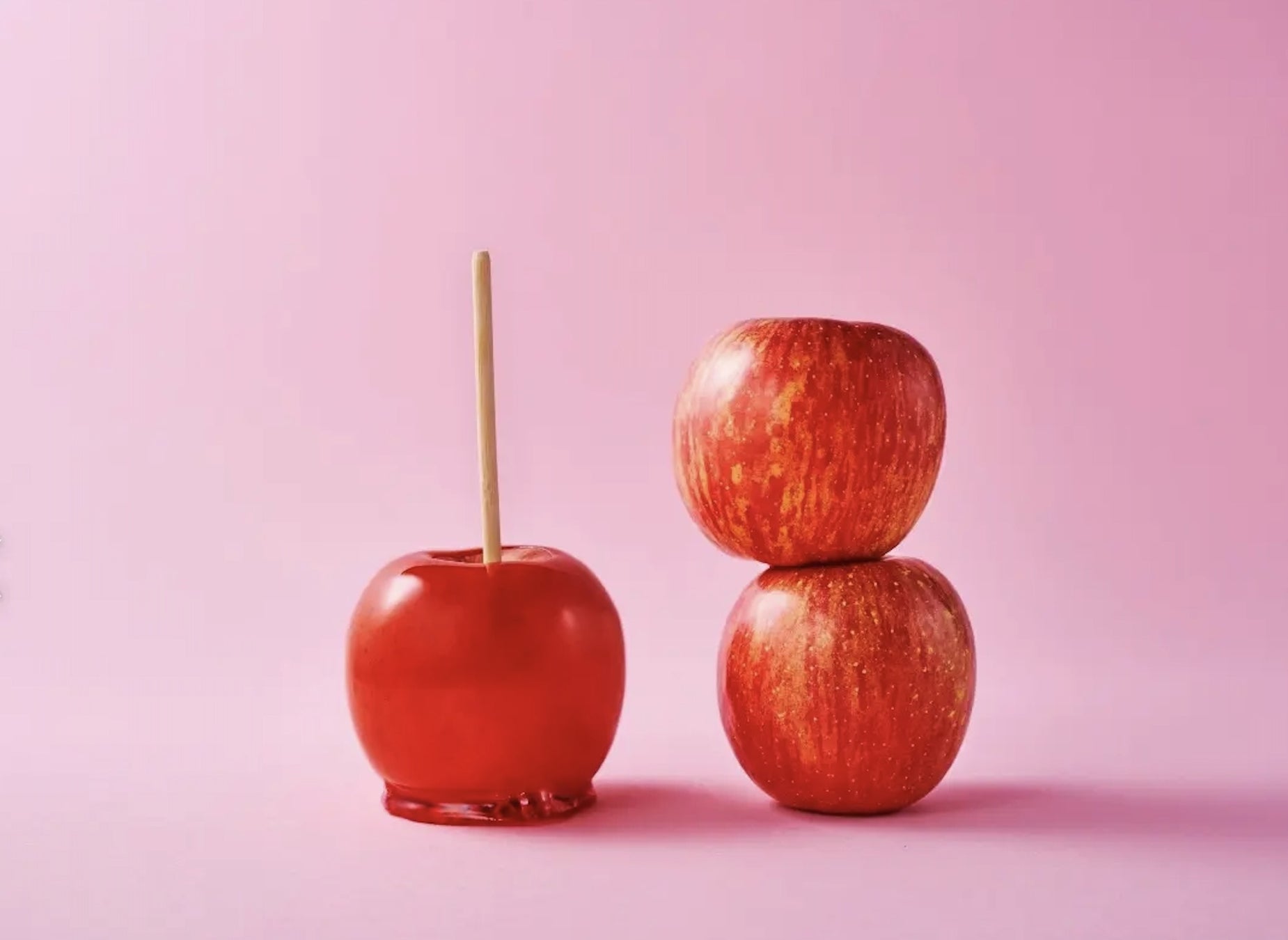 毎⽉その時期に合うブランドりんごを全国から取り寄せ、選別して作る本格りんご飴。りんごは「硬さ」「⽢さ」「酸味」「⾹り」「果汁」が、季節や産地によって全く異なるため、旬のりんごの旨味を最⼤限に引き出すための、飴作りの⼯程にもこだわりがあります。ジューシーな果汁を感じるりんごの⾷感と飴の⾷感に⼀体感が⽣まれるようにパリパリに仕上げ、飴は⼝の中で⼀瞬で溶け混ざり合うよう薄くコーティングしています。そのため⽢みの中に感じるりんご本来の酸味と⽢い⾹りが⼝いっぱいに広がります。