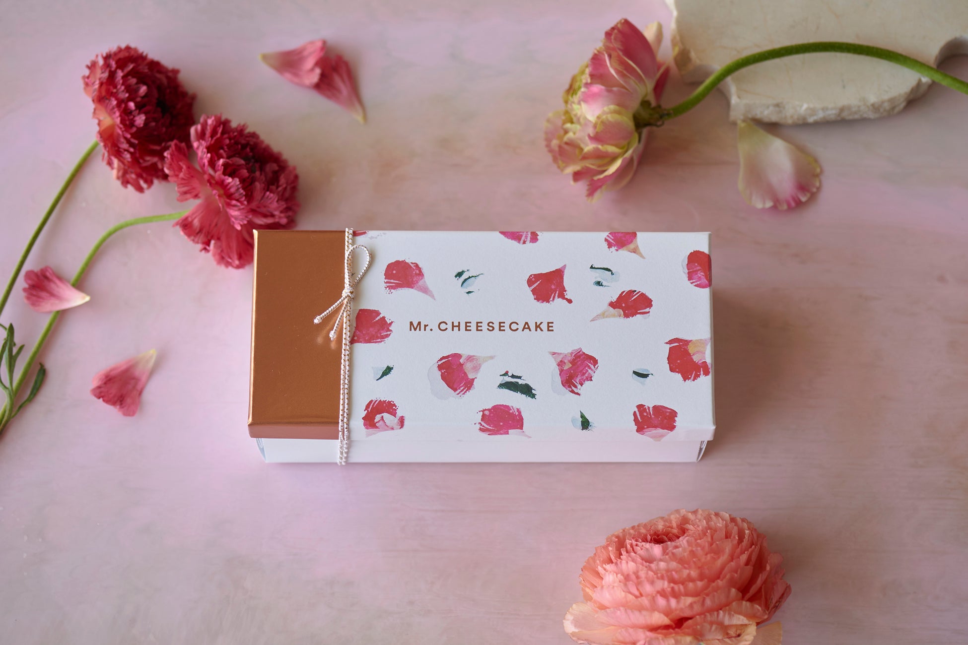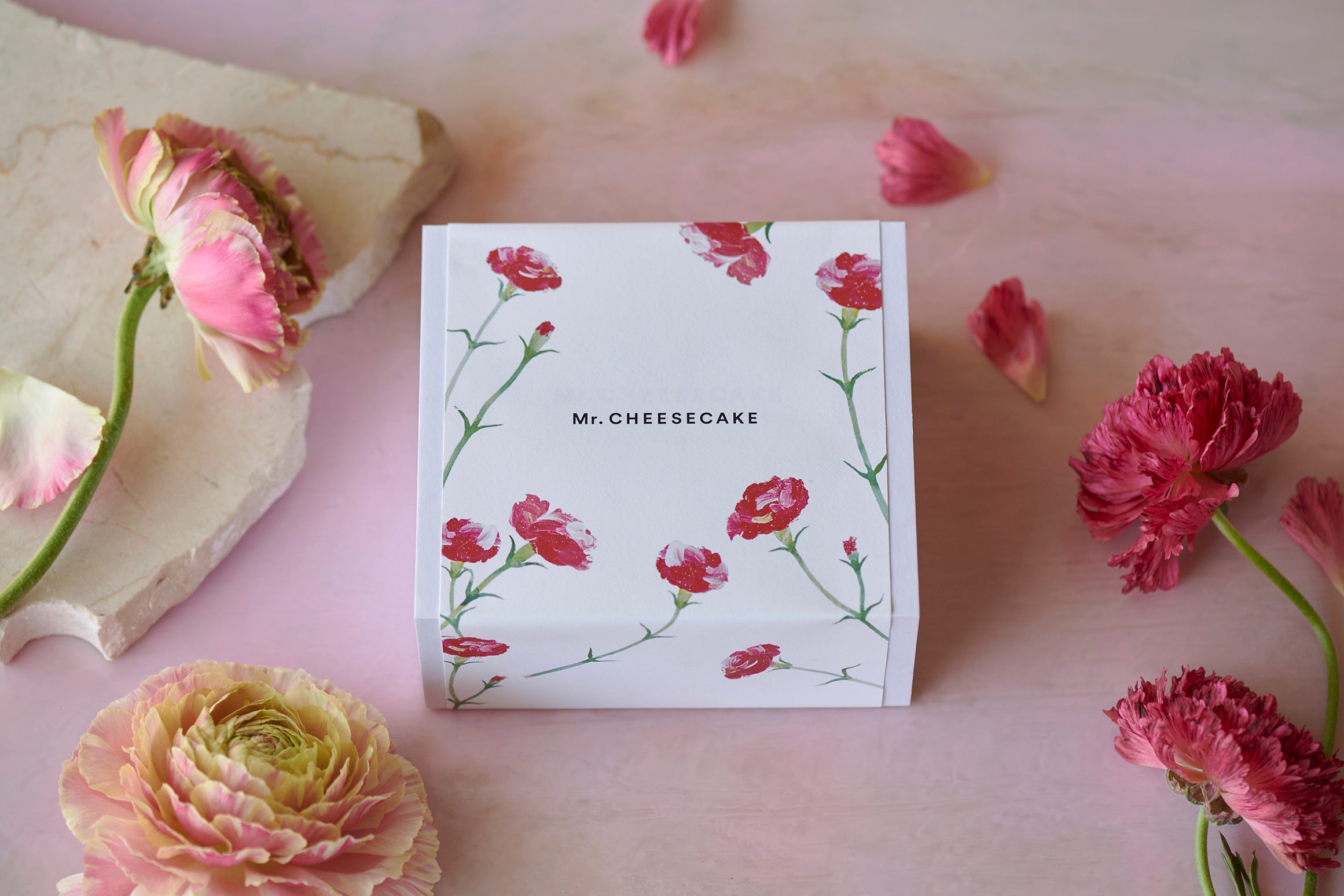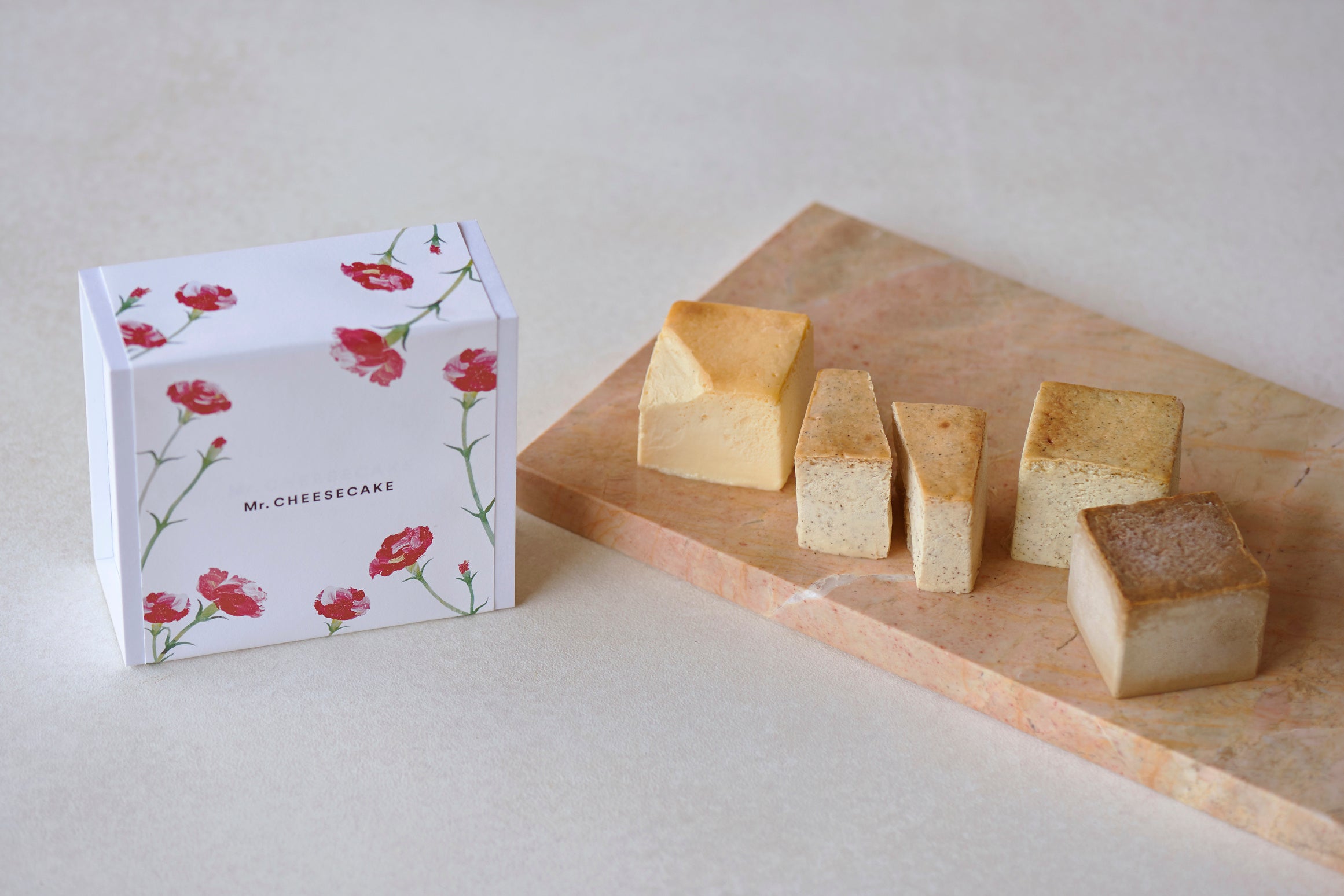 Mr. CHEESECAKE 通常フレーバーと、香ばしさとこっくりとした旨味の「Mr. CHEESECAKE Hojicha」、軽やかで酸味のある「Mr. CHEESECAKE Tohobijin」、甘く優雅な香りと心地よい渋みの「Mr. CHEESECAKE Jasmine」を一度に楽しめるアソートセット。大切な人とひと口ずつシェアできるキューブ型のケーキ4種をオリジナルのBoxに詰め、カーネーションのイラストが描かれた包装紙を巻いてお届けします。
