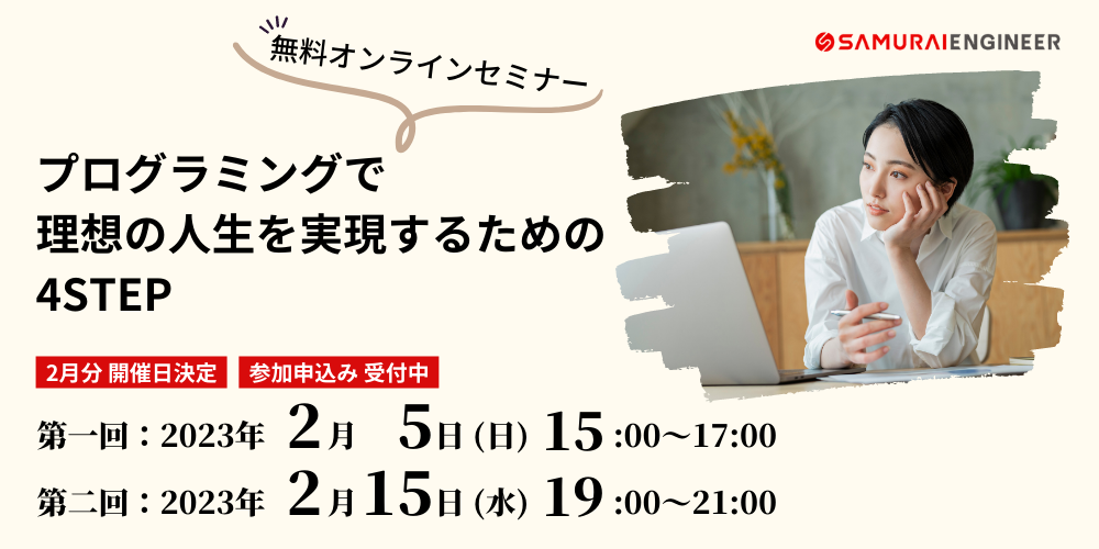 プログラミングスクール「SAMURAI ENGINEER」を運営する株式会社SAMURAI(本社所在地:東京都千代田区、代表取締役 :高比良 直人)は、無料オンラインセミナー「プログラミングで理想の人生を実現するための4STEP」の開催日を決定しましたのでお知らせいたします。