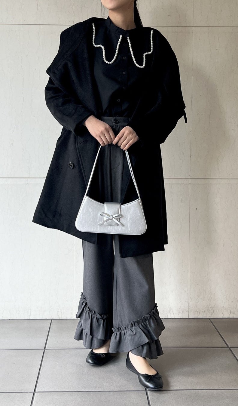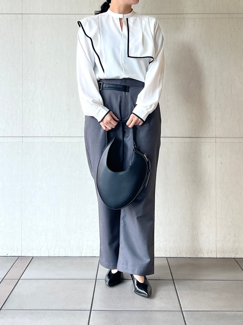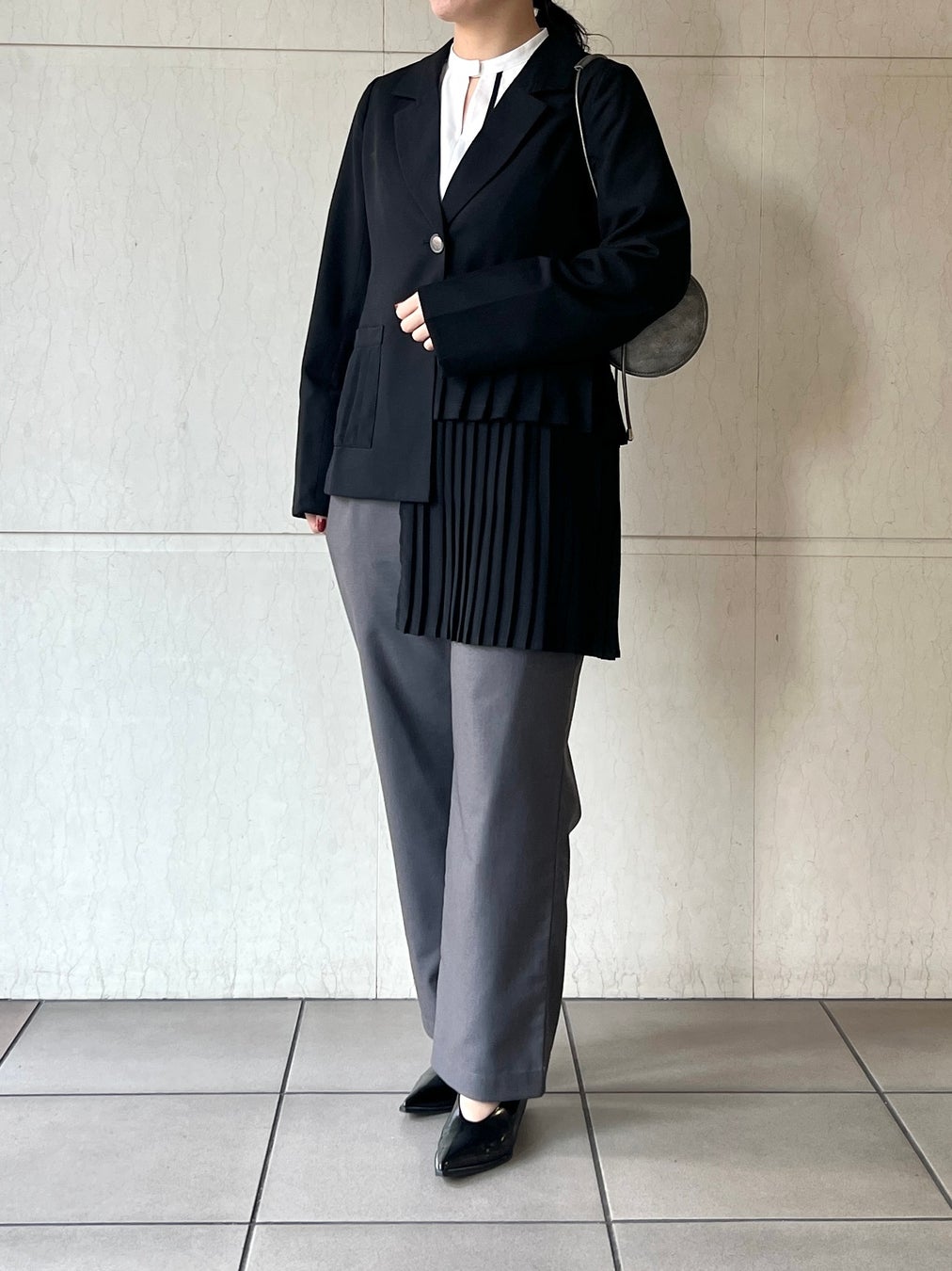 似通った印象にならない、モードな着回しコーディネート。配色感のあるシャツにシンプルなパンツを合わせることで、モードな雰囲気を演出し、ジャケットを脱ぐだけで華やかな印象に早変わりします。