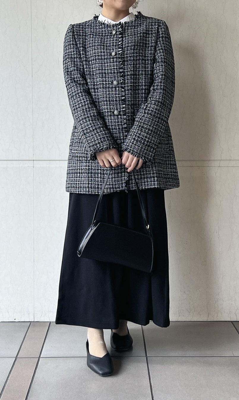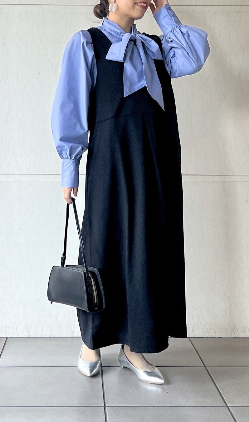 カジュアルなママさんにおすすめの着回しコーディネート。普段使いできるアイテムを軸に、カラーや柄を取り入れることでフォーマルなシーンにも自分らしさをプラスでき、ブラックのジャンパースカートも軽やかな印象にチェンジできます。