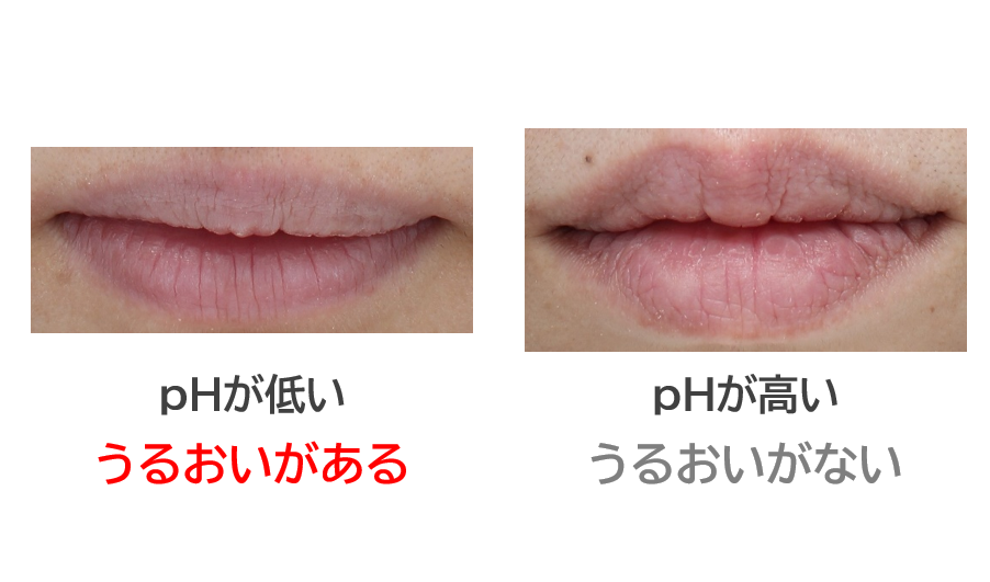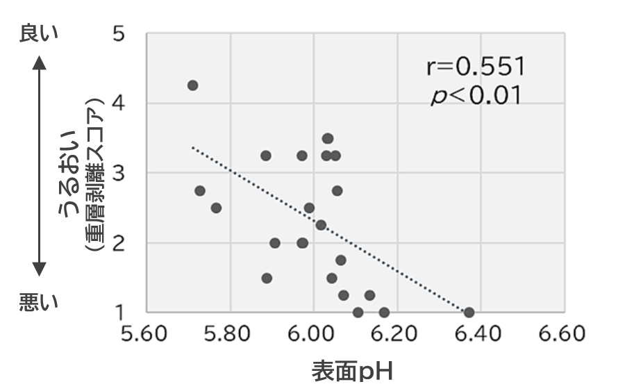 唇のうるおいの指標として、うるおいと関連があるとされる角質細胞の重層剥離の状態を評価しました。角質細胞はテープストリップ法により採取し、4名の皮膚科学研究従事者が重層剥離スコアを算出しました(スコアが高いほど重層剥離が少なく、唇の状態が良好)。重層剥離スコアと様々な生体因子との関連を解析した結果、表面pHが低いほど重層剥離スコアが高く、うるおいがあることがわかりました(図3)。このことから、唇の「うるおい」には表面pHが関与していることが明らかになりました。