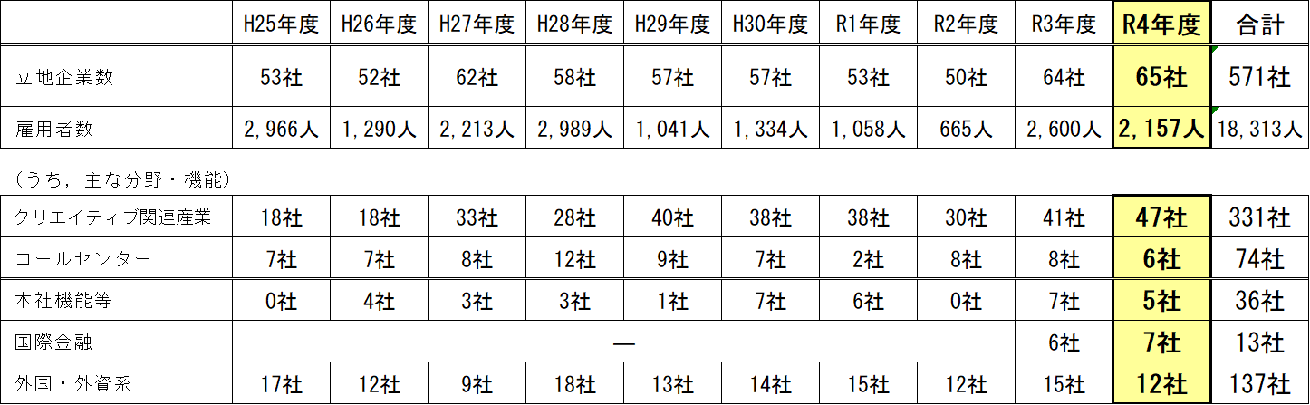 脱コロナの流れに加え、天神ビッグバン・博多コネクティッドによるハイスペックなオフィスビルの増加や国際金融機能の集積などの取組みにより、令和4年度の立地企業数は65社となり、2年連続で過去最高を更新しました。また、立地企業数は10年連続で50社以上に到達しました。
