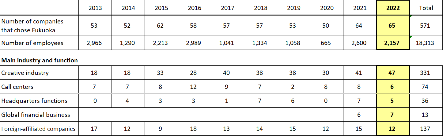 The number of companies locating to Fukuoka City reached 65 in FY2022, a record high for the second consecutive year. In addition to the trend of post-pandemic development, the city has been driven by the concentration of international financial functions and increase in high-specification office buildings as part of the Tenjin Big Bang and Hakata Connected development projects. Moreover, it was the 10th year in a row where the number of companies locating in the area reached 50 or more.