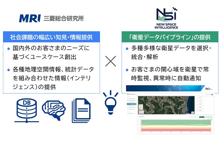 多様な社会課題解決に取り組む総合シンクタンクであるMRIの知見と、NSIが保有する「衛星データパイプライン」(※)を活用し、国内外のインフラ監視サービスや、衛星データと他の空間情報・統計データを組み合わせた海外情勢の分析などのサービスの開発・提供に協力して取り組みます。